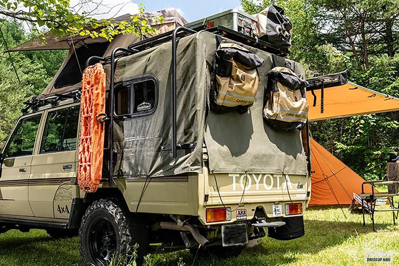 「このクルマで車中泊ができたら便利だなと思ったのがきっかけで、骨組みと幌と特注しました。米軍のランクルも幌を付けていたので、それも参考になりましたね」。
