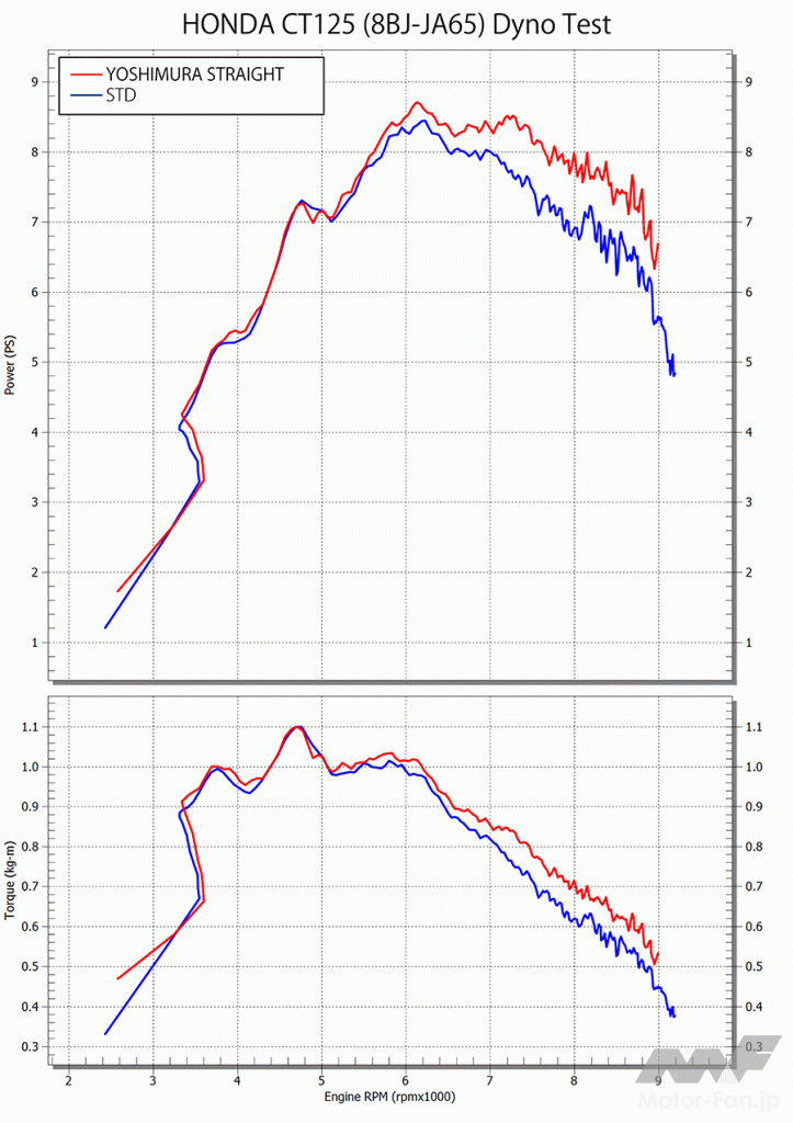 別体型のサイレンサーを持たないストレートサイクロンは、その構造から音量を規制値内に抑えつつ性能を出すことが難しい構造だが…長年培ってきたマフラー設計のノウハウにより、様々な規制に適合しながらも、走り出しから加速性能の向上を実現。特に6,000rpmからの大幅なパワー&トルクアップは、力強さを増したエンジンの鼓動感と相まって、ストレートサイクロンならではの走行フィールが体感できる。