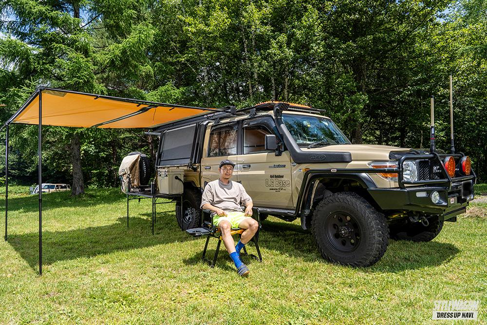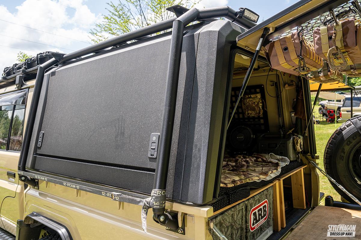 アウトドア派に限った話ではないが、クルマのカスタムユーザーのキーワードに「人とかぶりたくない」というものがある。どこまでも自分らしくありたいという気持ちを端的に表している言葉だが、Takaさんはベース車選びからこだわり、76と迷いつつ79を購入。車中泊をできるようにするためのキャノピーも、ポン付けでなはくロールゲージを合わせたり、表面にラプターライナー塗装を施すなど、オリジナリティのためならひと手間もふた手間もいとわない。