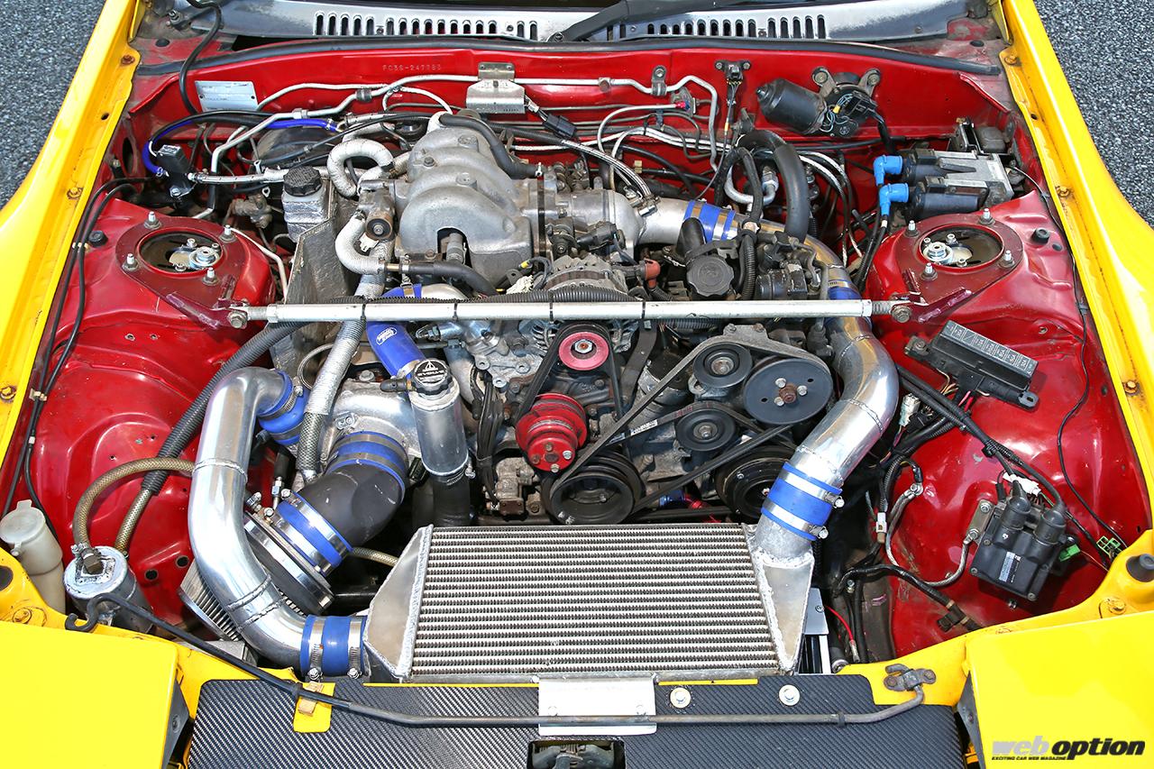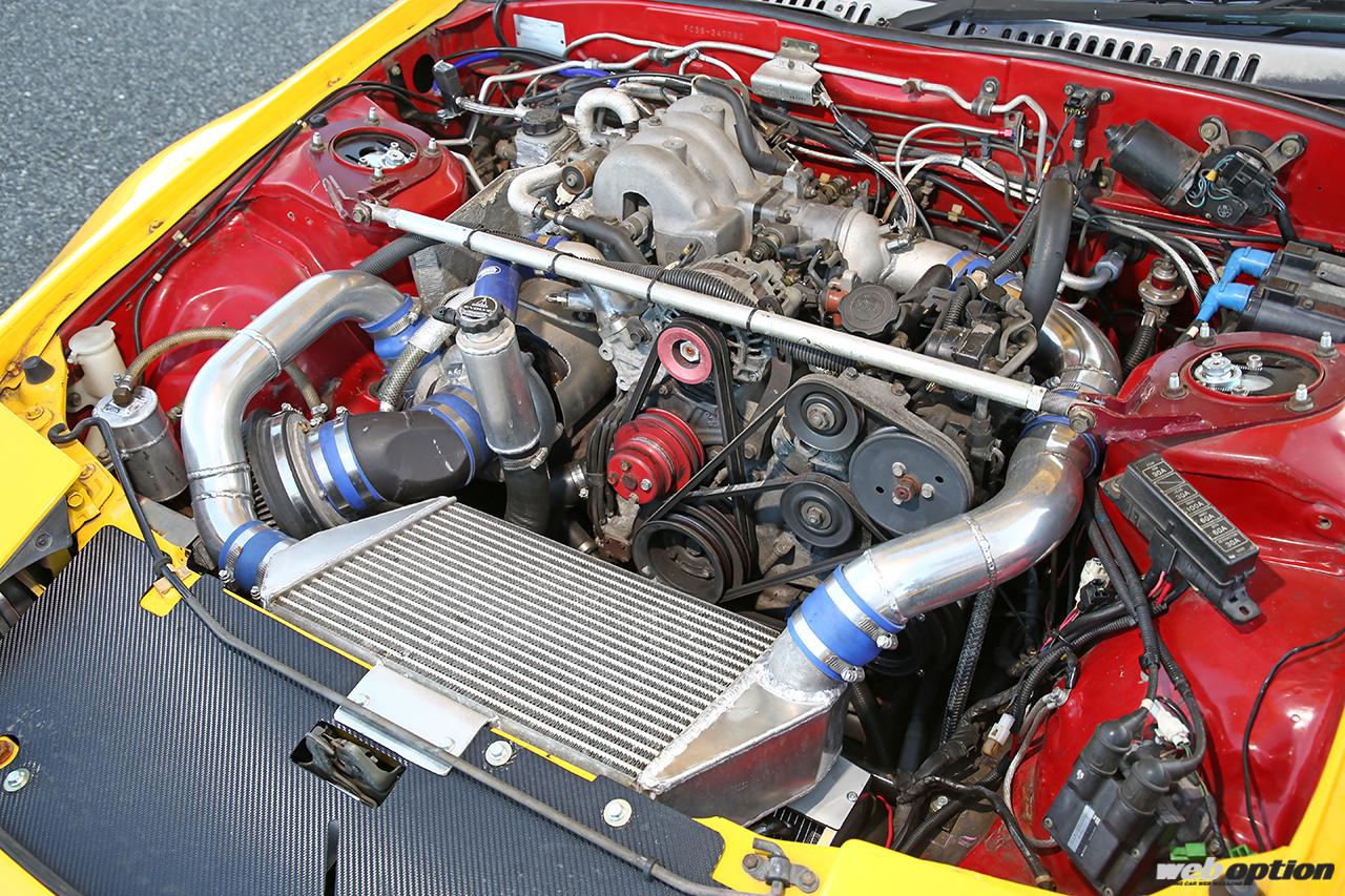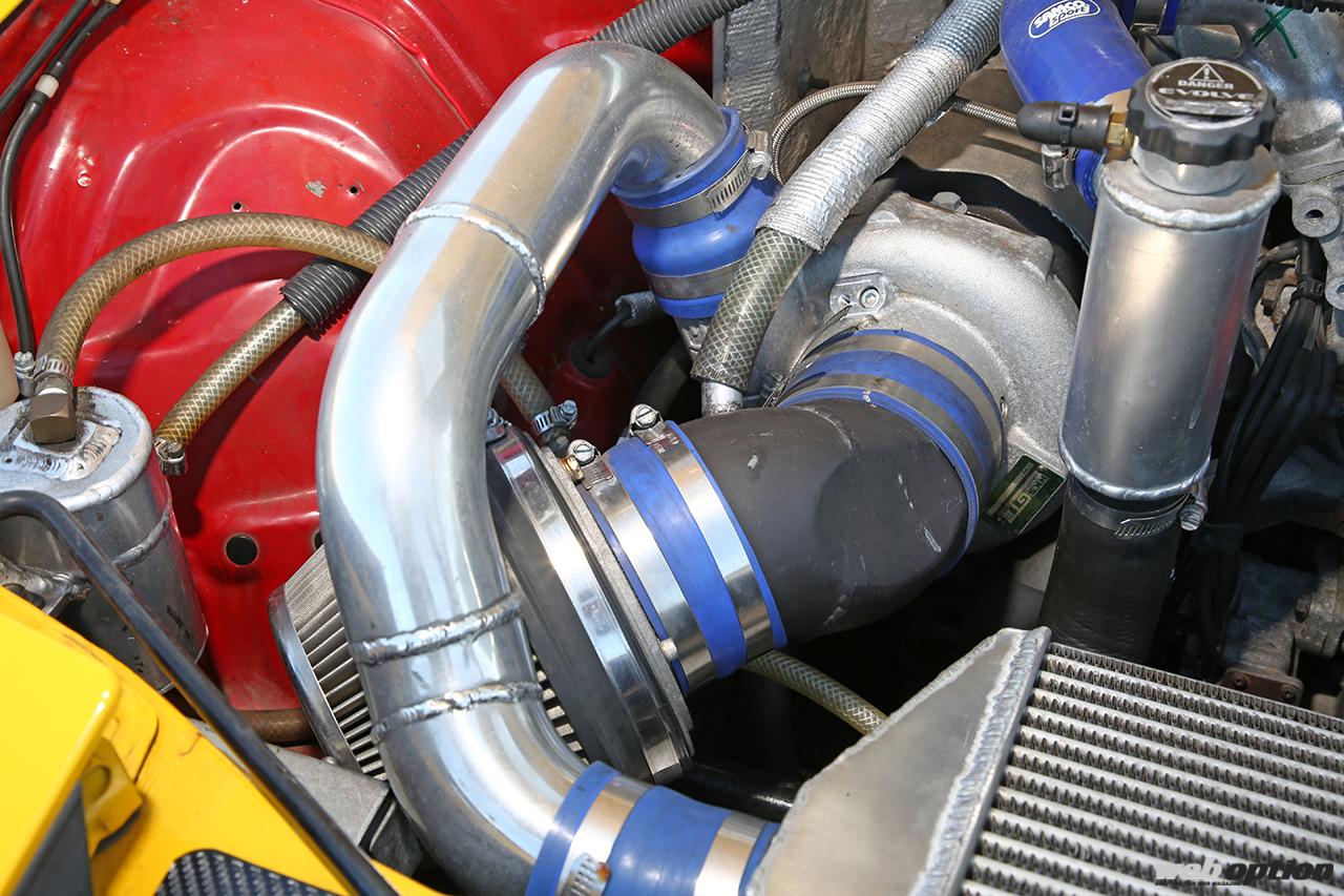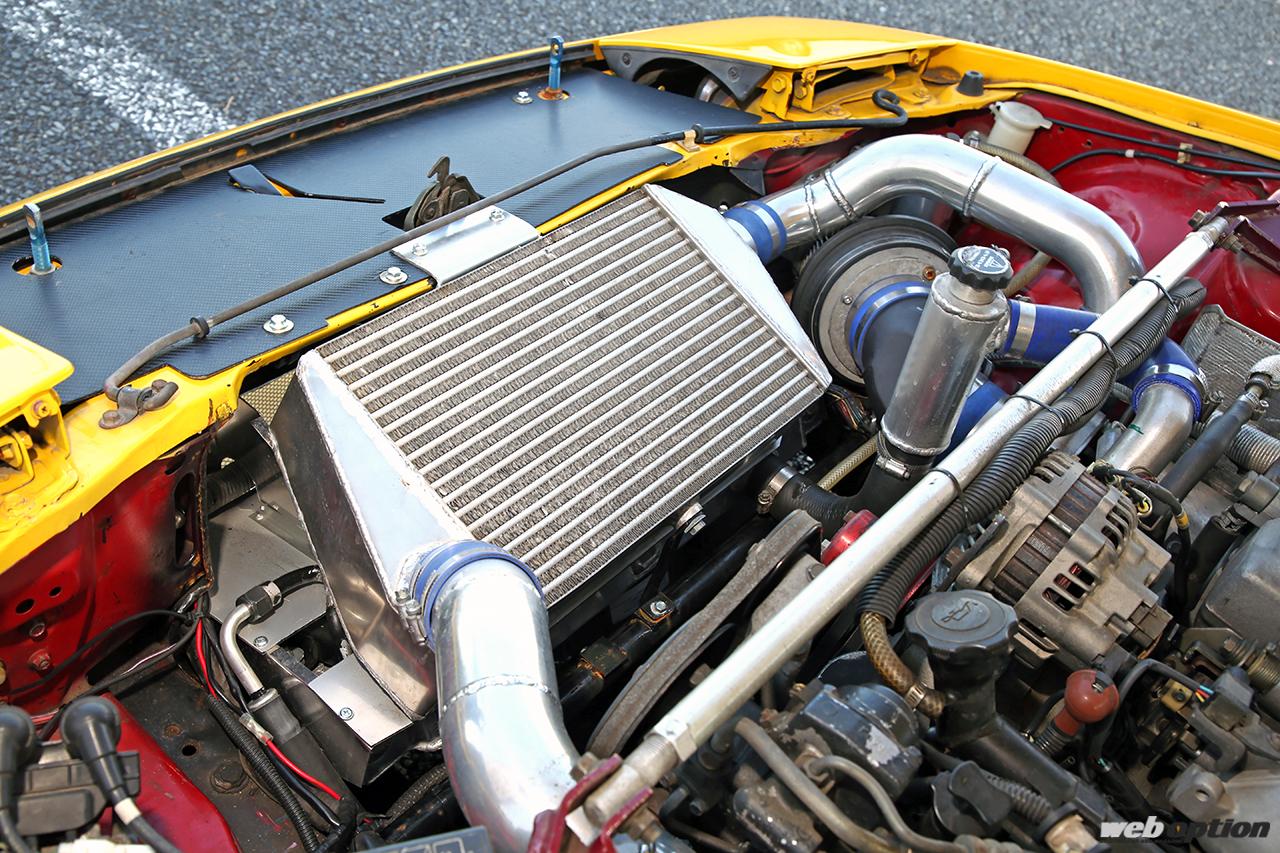 ボンネットの下に収まるエンジンはFD3S用の13B-REWで、ポート形状はパンスピード謹製のサイドポート拡大仕様となる。そこに、HKSのGTIII-4Rタービンをセットすることで実測420psを獲得。オリジナルのVマウントシステムにはワンオフのシュラウド(導風板)も装着され、最大限の冷却効率を追求している。