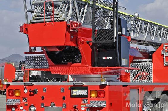 モリタの独自開発により1985年(昭和60年)からリリースされているはしご車が『スーパージャイロラダー』シリーズで、はしごの起伏角度は-10~75度、仰角のみではなく、俯角、すなわち斜め下方向にはしごを伸ばすことが可能な点が特長です。たとえば水難事故などで、はしご車の位置よりも低い位置に要救助者がいる場合に、これは有効な機能なのです。また、バスケットやリフター装置など、様々な現場に対応できる機動力をはじめ、自動的にはしごを水平に保つ“ジャイロターンテーブル”、急激な動作による危険を防止する“操作速度自動制限装置”、誤作動による事故を防止する“インターロック装置”など、さまざまな最新の制御技術が搭載されています。