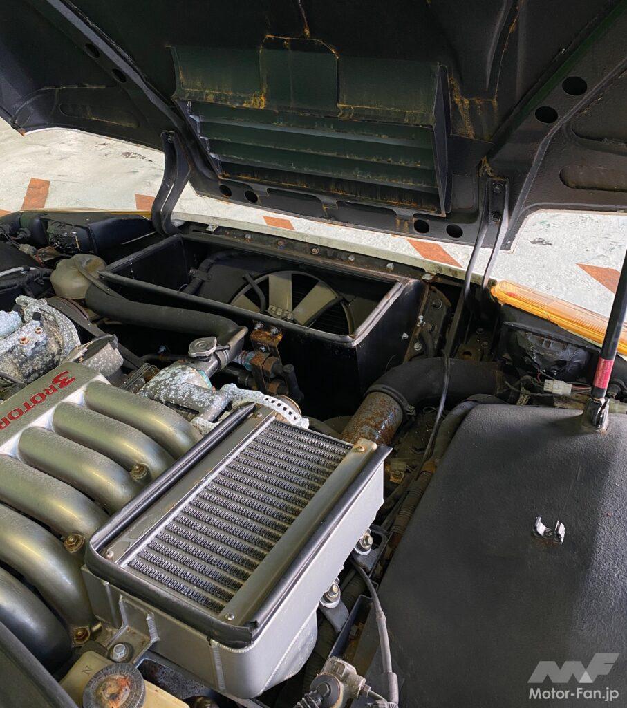 ボンネットは前ヒンジで開く。エンジンルームはアルミ部品を中心に錆が広がっていた。レストアを考えると、錆が表面だけでとどまっていることを祈らざるをえない。なにしろこのクルマだけのために作られたエンジンだ。MX-81のレストアでは「動かす」ことを優先して量産ファミリア・ターボのエンジンに換装したが、MX-03の低いボンネットに量産ユーノス・コスモのスリーローターが収まるかどうか・・。