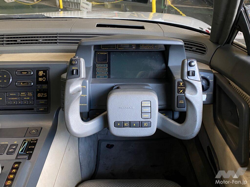 ステアリング機構には極低速では60度の舵角でフルロックとなる速度感応式の可変ギアレシオを採用。操縦桿スタイルのステアリングはそれを活かしたデザインだ。さらに表示系にはデジタルメーターやヘッドアップディスプレイを使うなど、当時の先進技術を余すところなく盛り込んでいた。