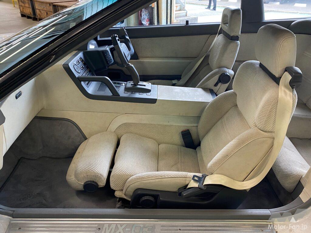 広島のマツダ本社敷地内の、本社ビルとは川を挟んだ淵崎という地区にある試作倉庫。古びた建屋の一角に、それは静かに佇んでいた。85年秋にフランクフルトショーでデビューし、翌月の東京モーターショーにも展示された「MX-03」スリーローター・ターボを積むコンセプトカーが、37年の時を超えてついにその姿を現したのだ。