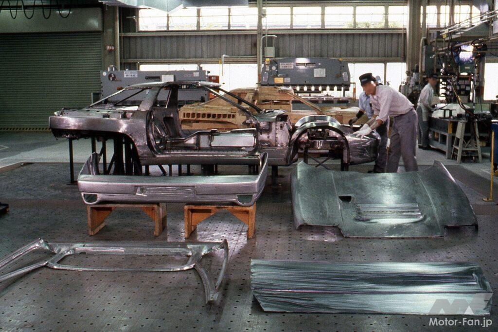 リヤにはトランクリッドと一体成形されたスポイラーがある。ここだけはFRP製で、その他のボディパネルはバンパーを含めて鉄板だ。デザイナーが描いた形状をベースに木型を作り、それに合わせて鉄板を叩き出していく。イタリアのベルトーネがデザイン/製作したMX-81と同じようなプロセスを、MX-03も辿った。