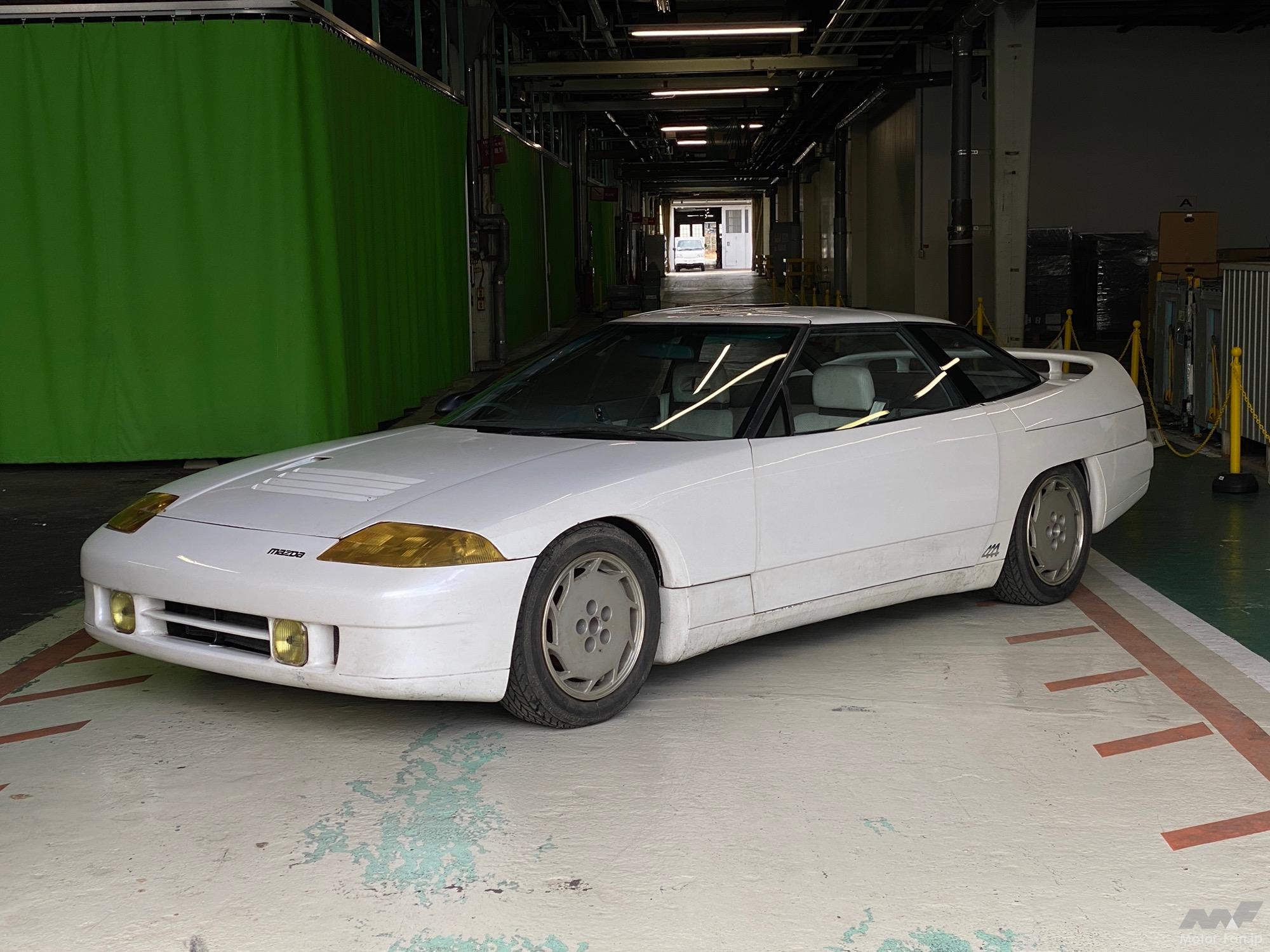 広島のマツダ本社敷地内の、本社ビルとは川を挟んだ淵崎という地区にある試作倉庫。古びた建屋の一角に、それは静かに佇んでいた。85年秋にフランクフルトショーでデビューし、翌月の東京モーターショーにも展示された「MX-03」スリーローター・ターボを積むコンセプトカーが、37年の時を超えてついにその姿を現したのだ。