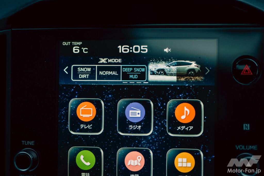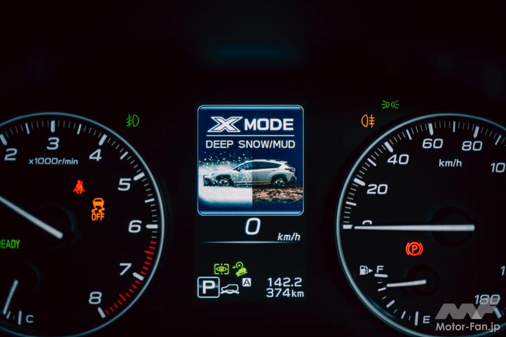 それでも、積極的にオフロードやウィンターシーズンを楽しみたいアクティブなユーザーには、やはりAWD車を勧めたい。スバルが伝統とする悪路走破にも長けたシンメトリカルAWDには、滑りやすい路面の走りをサポートする「X-MODE」も加わる。雪上やぬかるみなどの脱出にも威力を発揮するほか、不安定な路面の下り坂で、常に一定の車速を維持してくれ、ドライバーがステアリング操作に集中できる「ヒルディセントコントロール」も含まれる。まさにクロストレックに金棒といったところだ。FWD車とAWD車の価格差も20万円に留まるので、迷ったらAWD車を選んでおけば間違いない。