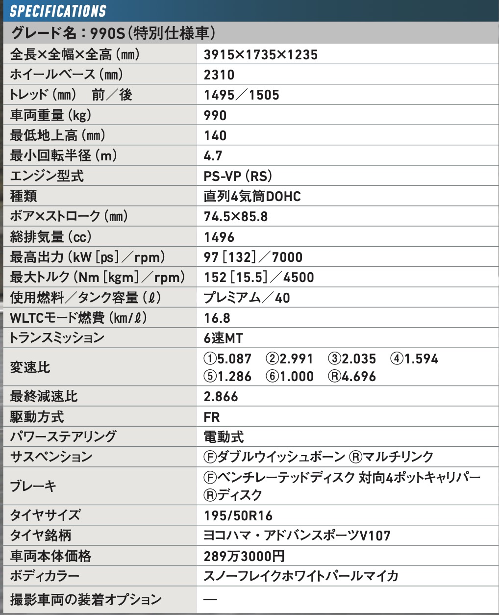 KPCの恩恵を最も受けているのが、リヤのLSDやスタビライザーを搭載せずに軽量化に突き進んだ990Sである。その名が示す通り、この特別仕様車は車重990kgを達成。Sというグレードで同様のものが存在するが、この990Sは内容がかなり異なり、ブレンボ製対向ブレーキ、レイズ製ホイール(6.5Jから7.0Jへ拡大)などを装備した、走りを意識したグレードとなっている。幌内側のインシュレーターも持っていないなどかなり硬派だ。また今回のマイナーチェンジで足まわりのセッティング変更も行なった唯一のモデルでもある。スプリングレートをアップさせる一方で、ダンパーはしなやかなセッティングを施すなど、新たな挑戦を行なっているところにも注目だ。
