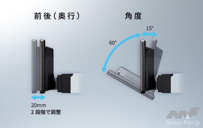 2DINのスペースに収める場合は、「DMH-SF500」本体と余った1DIN分の隙間を埋めるDサイズ小物入れ「AD-379」を組み合わせることによりスッキリ設置することができる。また、フローティングタイプなので、ハザードランプやシフトレバーなどと重なってしまう場合でも、上下に60mm、左右に30mmずつ、奥行き20mmの範囲でディスプレイの位置を調整できるので、干渉を避けてセッティングすることができる。