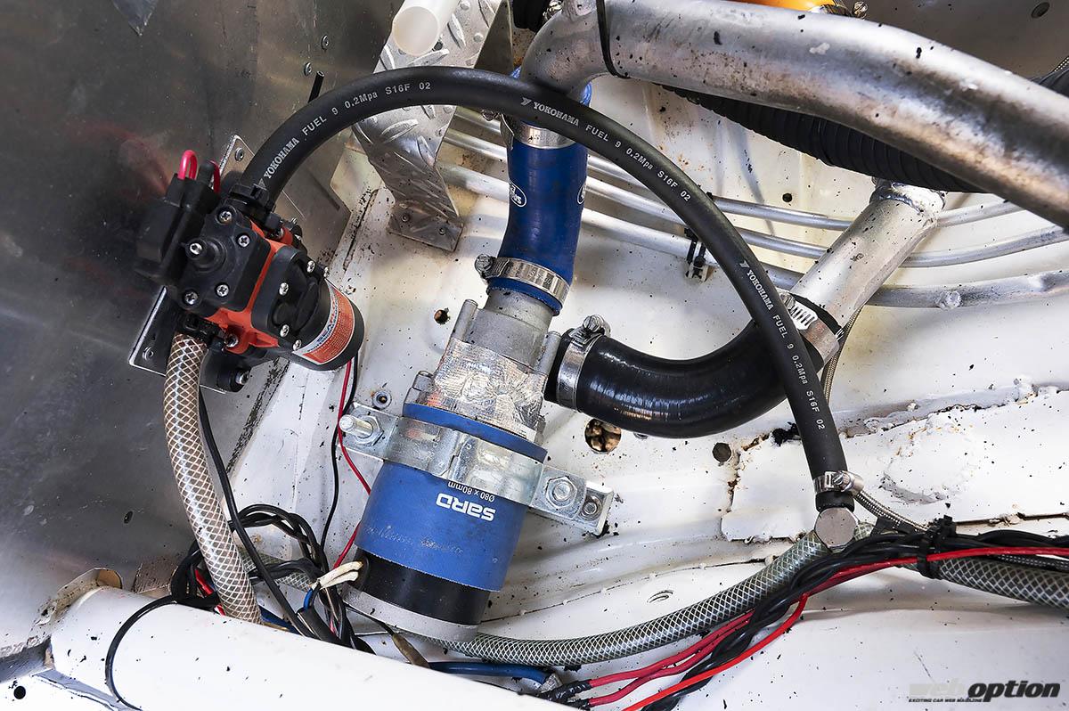 ブルーのシリコンホース付きがウォーターポンプ。左側はラジエターやオイルクーラーのウォータースプレー用ポンプだ。
