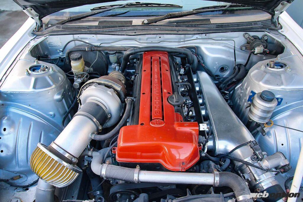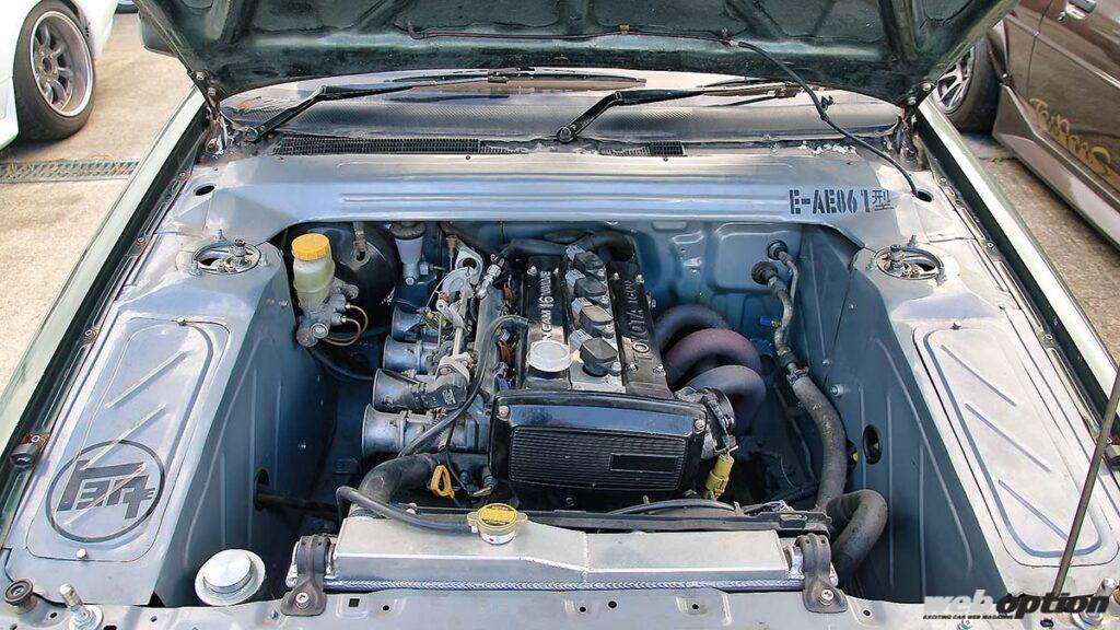こちらは、AE92後期をベースにしたスポーツインジェクション仕様のAE86。低予算でエンジンルームをスッキリさせるべく、アルミパネルを駆使した独自のブラインド仕様を構築している。