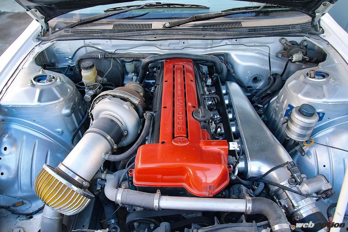 このS15シルビアは、競技ドリフト仕様としてツインズが製作したチューンド。エンジンは2JZの腰下に1JZのヘッドを組み合わせた通称“1.5JZ”で、パイピングから配線関係のワイヤリングまで徹底追求。ショーカーレベルのエンジンベイを実現しているのだ。