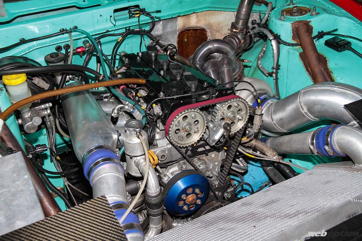 エンジンは5A-G(1720cc)仕様にスケールアップした上で、ギャレットG30-770タービンを装着。ブースト1.7キロ時に約500psを発生させる仕様で、インタークーラーとラジエターはVマウント化されている。