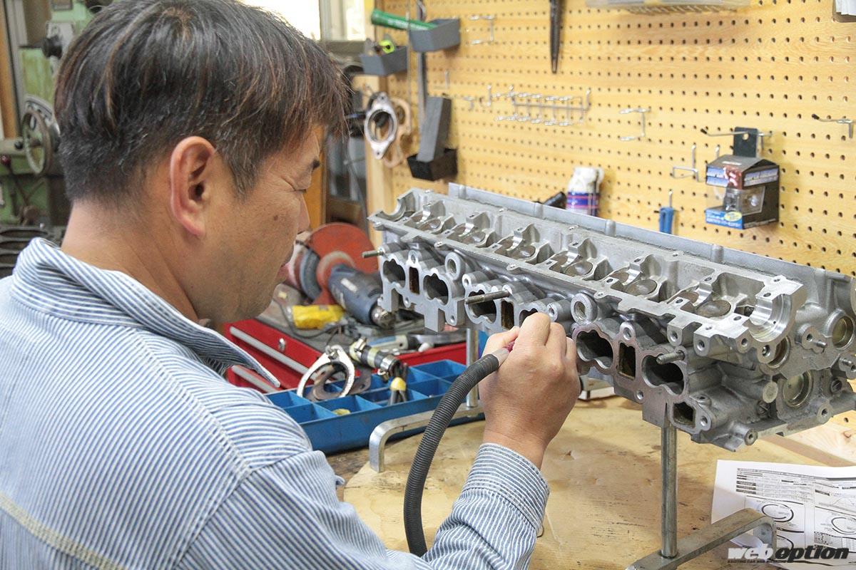 ピット奥のエンジン室では、機械加工の作業中。取材当日も、4A-GやRBなど複数のエンジンの作業が同時進行で進められていた。