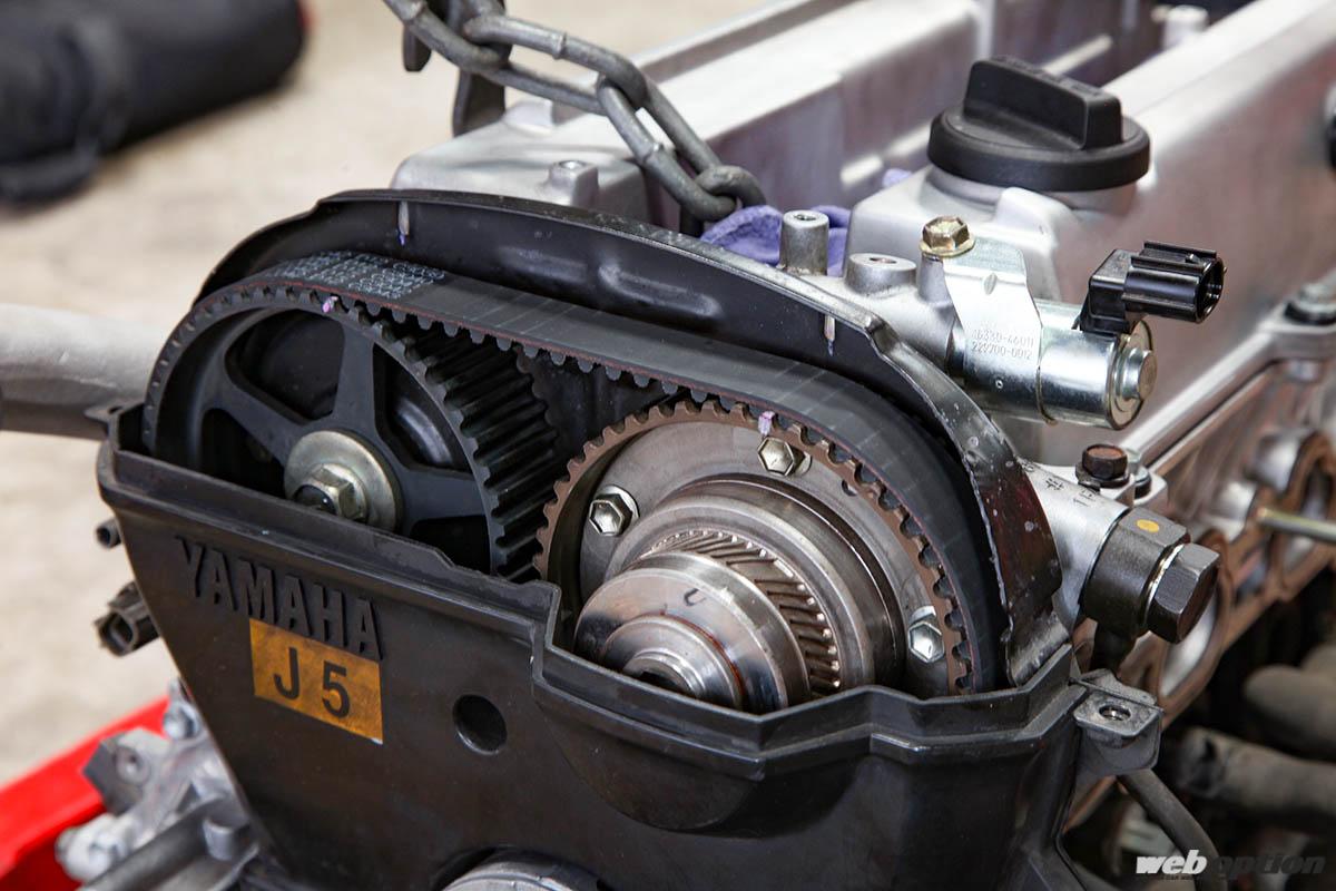 1JZの弱点として良く知られるのがクランクシール部からのオイル漏れ。また、ゴム部分が硬化してクランクプーリーが脱落してしまうケースも多い。「どちらも、タイミングベルトと同じような感覚での交換を推奨してます。一度作業をすれば、また10万kmは普通に乗れますからね」と谷口さん。