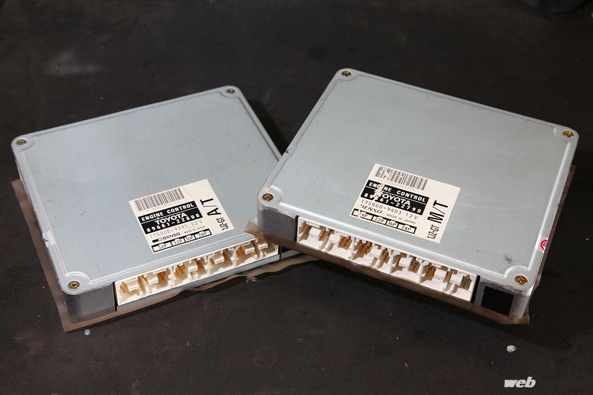 経年劣化によって内部の電解コンデンサが液漏れを起こし、それが基盤を侵して不調をきたすことが多い純正ECU。そこで、たにぐち自動車では電解コンデンサを交換して通電テストを行ない、10年保証を付けて販売する。写真はエンジン用ECU(6万500円)だが、電子制御スロットル用オーバーホール済みECU(4万9500円)も用意。