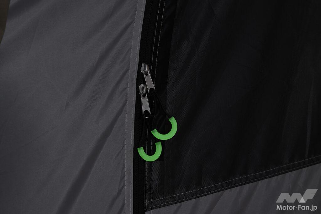 インナーテントのファスナーには、夜間の視認性を上げるため、蓄光タイプの引手を採用(写真下)。 ※フライシートの引手は従来品と同じ反射材入りパラコード引手を採用。