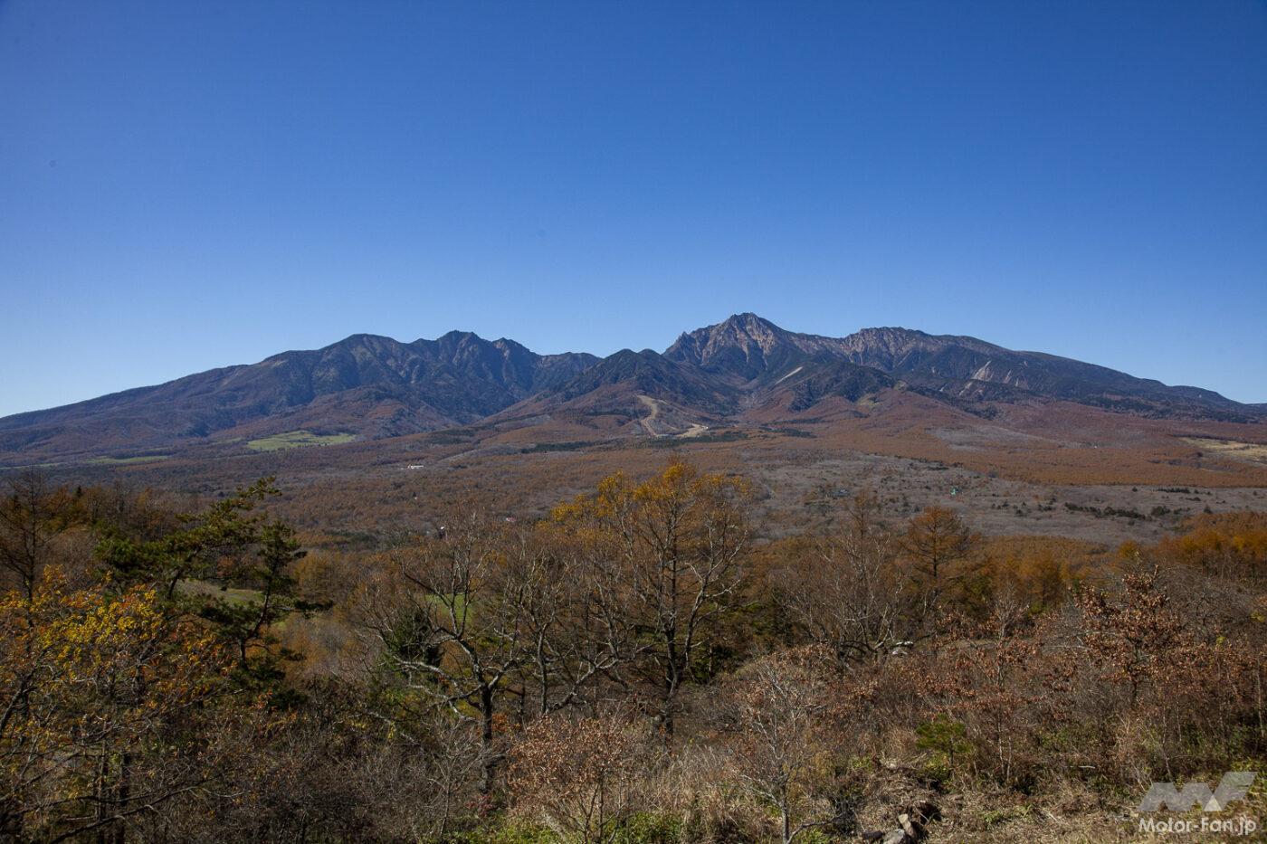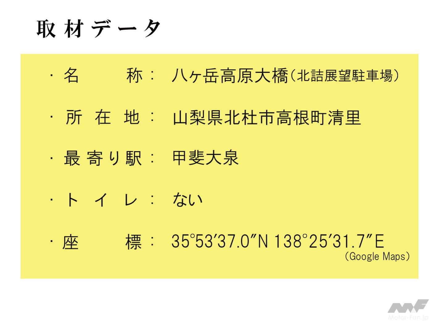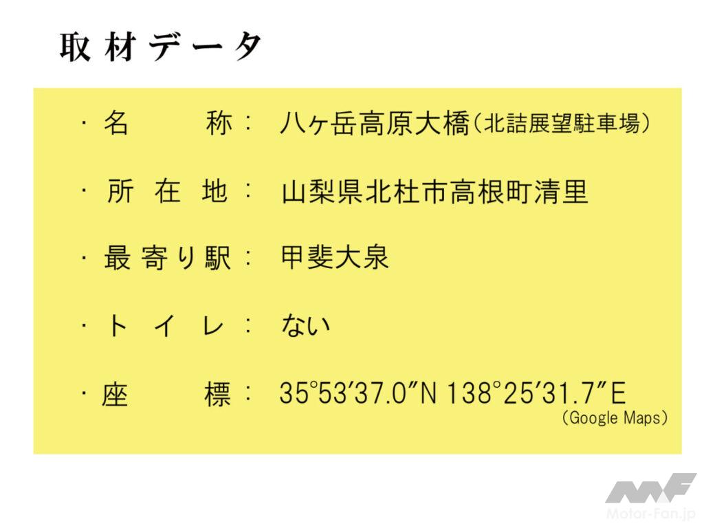 今回、取材データの座標点と住所で示すポイントは、中央自動車道路の長坂インターチェンジから清里方面へ約9km(車で約15分)の地点にある「八ヶ岳高原大橋」を渡った先の左手にある「北杜展望駐車場」です。八ヶ岳高原ラインと比較すると、舗装は新しく屈曲も穏やかで路面が綺麗。そして周辺の景色が開けていて、天気の良い日に目に飛び込んでくる八ヶ岳など、パノラマの様に広がる山並みの眺めが最高です。座標点の駐車場はトイレ等の施設はありませんが、周辺にはさほど遠くない位置に様々な施設があるので、休憩や食事場所に困ることはないでしょう。