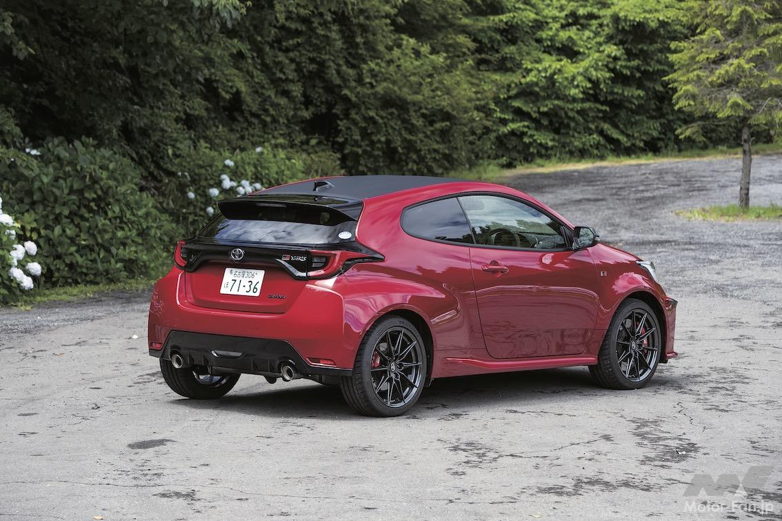前輪側にバイアスが掛かった〝ノーマル〞、後輪側にバイアスの掛かった〝スポーツ〞、そして前後輪に均等の配分が行なわれる〝トラック〞という4WDモードの切り替えによるハンドリング感覚の違いをドライ舗装の公道上で顕著に体感することはなかなか難しいが、それでも、スポーツモードでの走りでは、コーナーでの積極的なパワーオンで後輪側が外側へとはらみ出そうというテイストを実感。戦うために生まれて来た圧倒的な走りの能力のもち主であるGRヤリスは特に今の時代、日本のみならず世界でも稀で貴重な存在と断言できる存在だ。