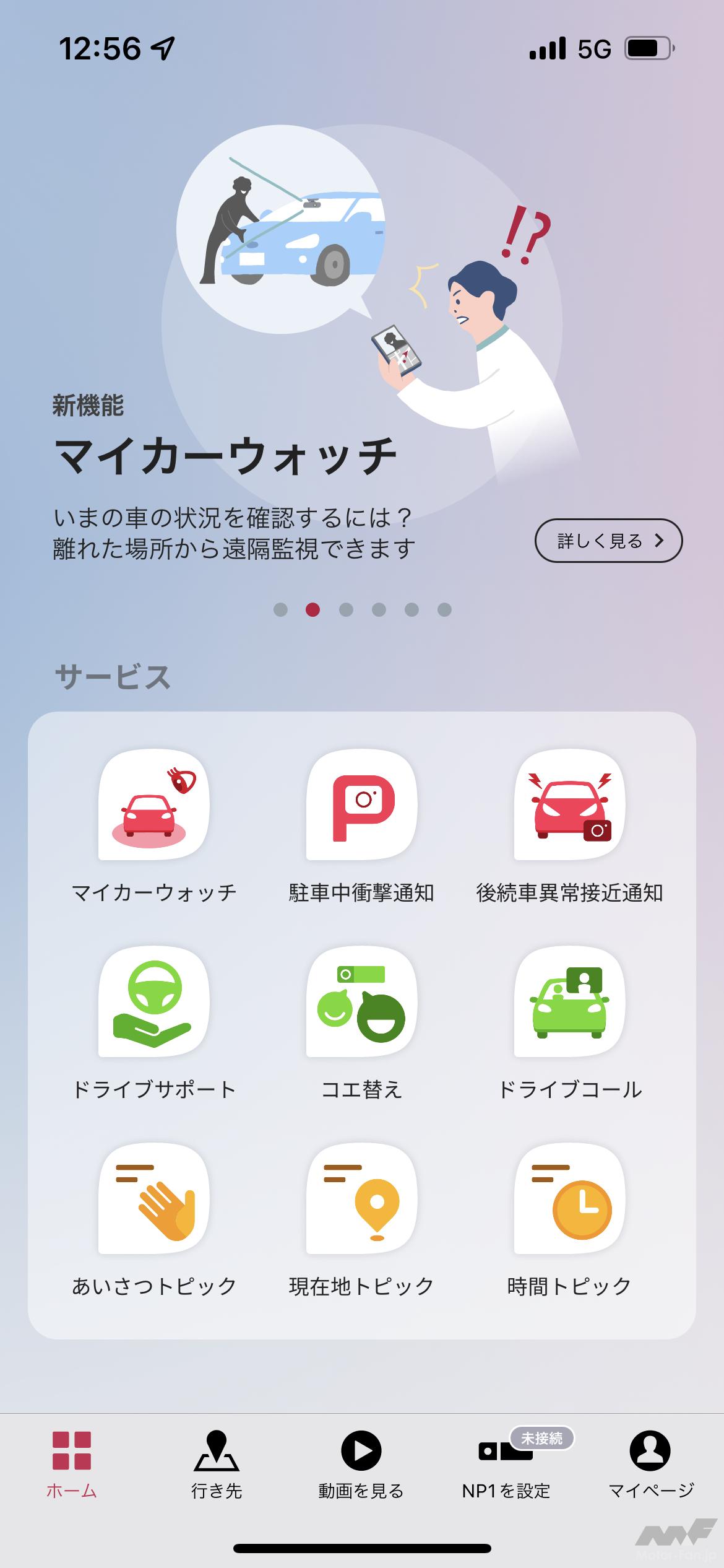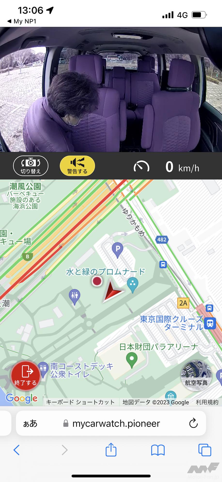 3. 異常検知の通知を見てスマホを操作することで、遠隔操作で現在の車載カメラの映像が確認できる。カメラの前に不審人物がいれば、実際にその姿をカメラで捉えることができるということだ。NP1には「マイカーウォッチ」としてこうした機能を実装している。