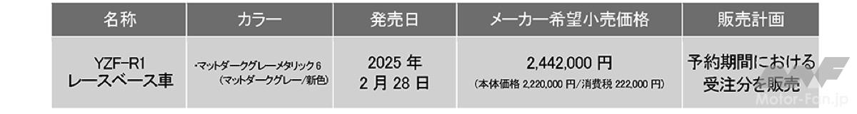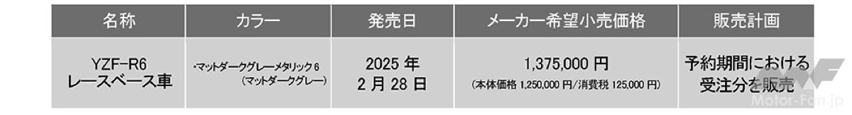ヤマハ発動機は、「YZF-R1」および「YZF-R6」のレースベース車(2025年型)を発表した。価格は「R1」が税込244万2000円、「R6」が137万5000円となる。発売日は両車ともに2025年2月28日だが、予約受注限定販売となる。予約期間は第一次期間が2024年9月25日(水)〜10月9日(水)、第二次期間が2024年10月10日(木)〜11月29日(金)となる。レースベース車は、通常のモデルからヘッドランプ、ミラー、タンデム装備といった公道走行および車検通過に必要な装備を除いた車両となる。