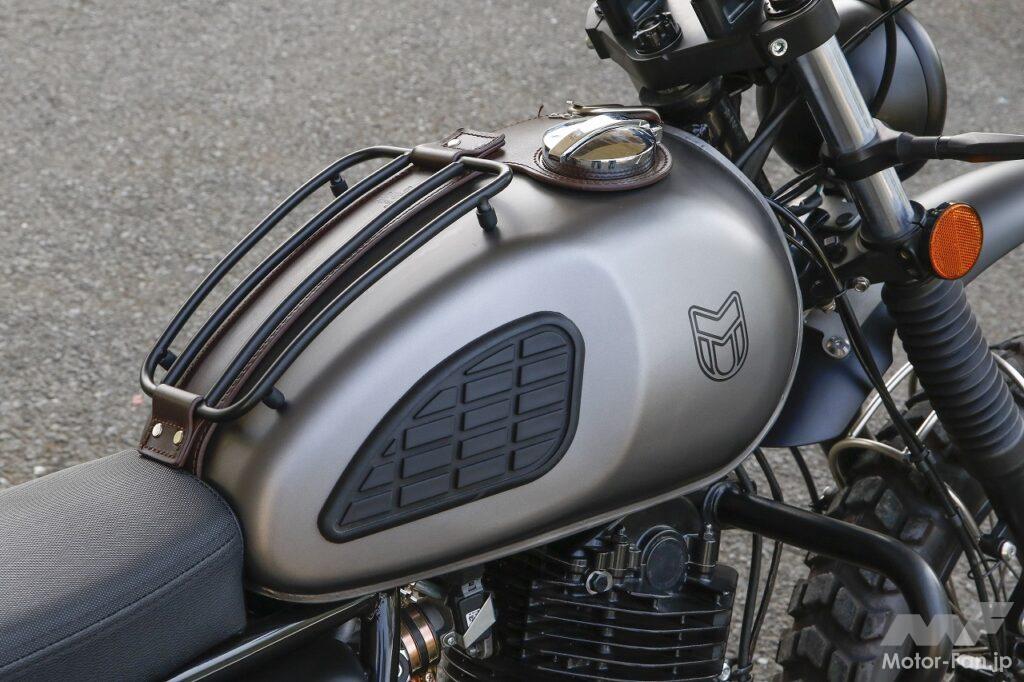 荒野を駆ける姿がもっとも似合うバイクの1台がMUSHMANじゃないかと思います。60年代のスクランブラーを彷彿させるスタイルは、とてもワイルドです。デザインの基本はトラディショナルなモデルなのですが、ショートタイプのフロントアップフェンダーやステンレス製フォークブレース、エンジンガードバー、タンクパッド、そしてレザーとスチールのタンクラックなどが装備され、足回りを固めた極太の18インチブロックタイヤと合わせて、武骨なスクランブラーバイクへと造り上げられています。マット系のボディカラーとのマッチングもバッチリです。