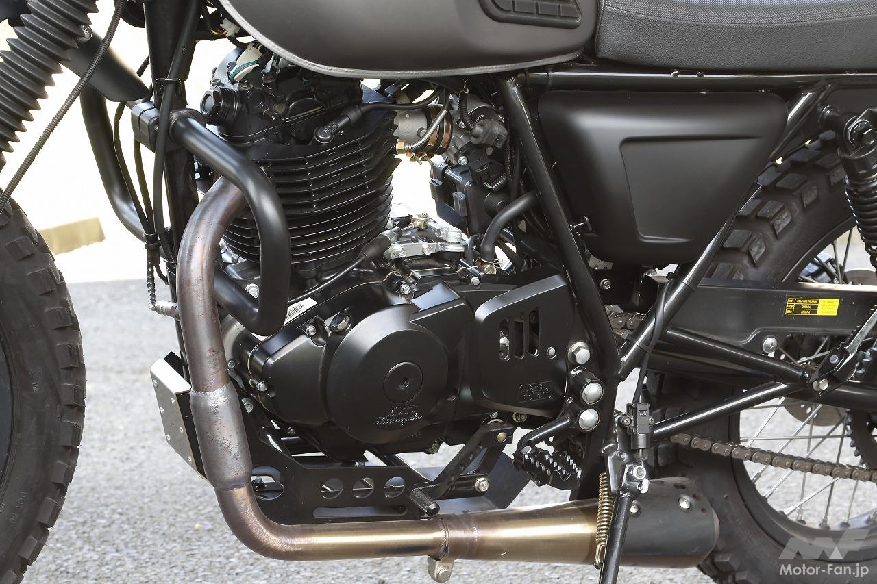 心臓部の空冷シングルエンジンは、わずか13kW(17.2hp)の最高出力しか発揮しませんし、最大トルクだって18Nmです。250㏄の排気量からしても動力性能は低めです。「そんなパワーしか出ないんじゃ走っても楽しくない!」と思う人もいるでしょう。でも、この空冷シングルは歯切れの良いサウンドとフィーリングをもたらしてくれるのです。たしかにパワフルじゃありませんけどエンジンの存在感はライダーに伝えてきます。