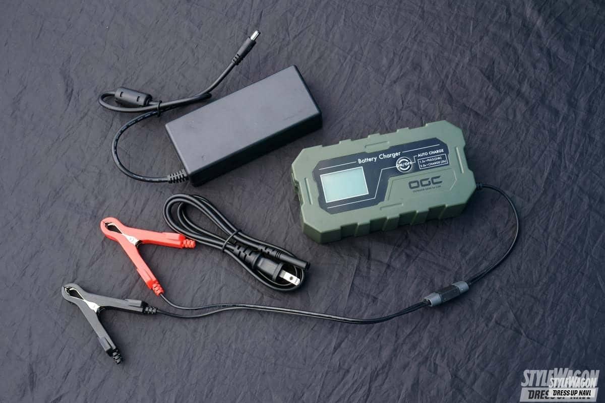 充放電を繰り返せるディープサイクルバッテリー。使用後はバッテリーチャージャーを使い自宅のAC 電源で充電をしよう。