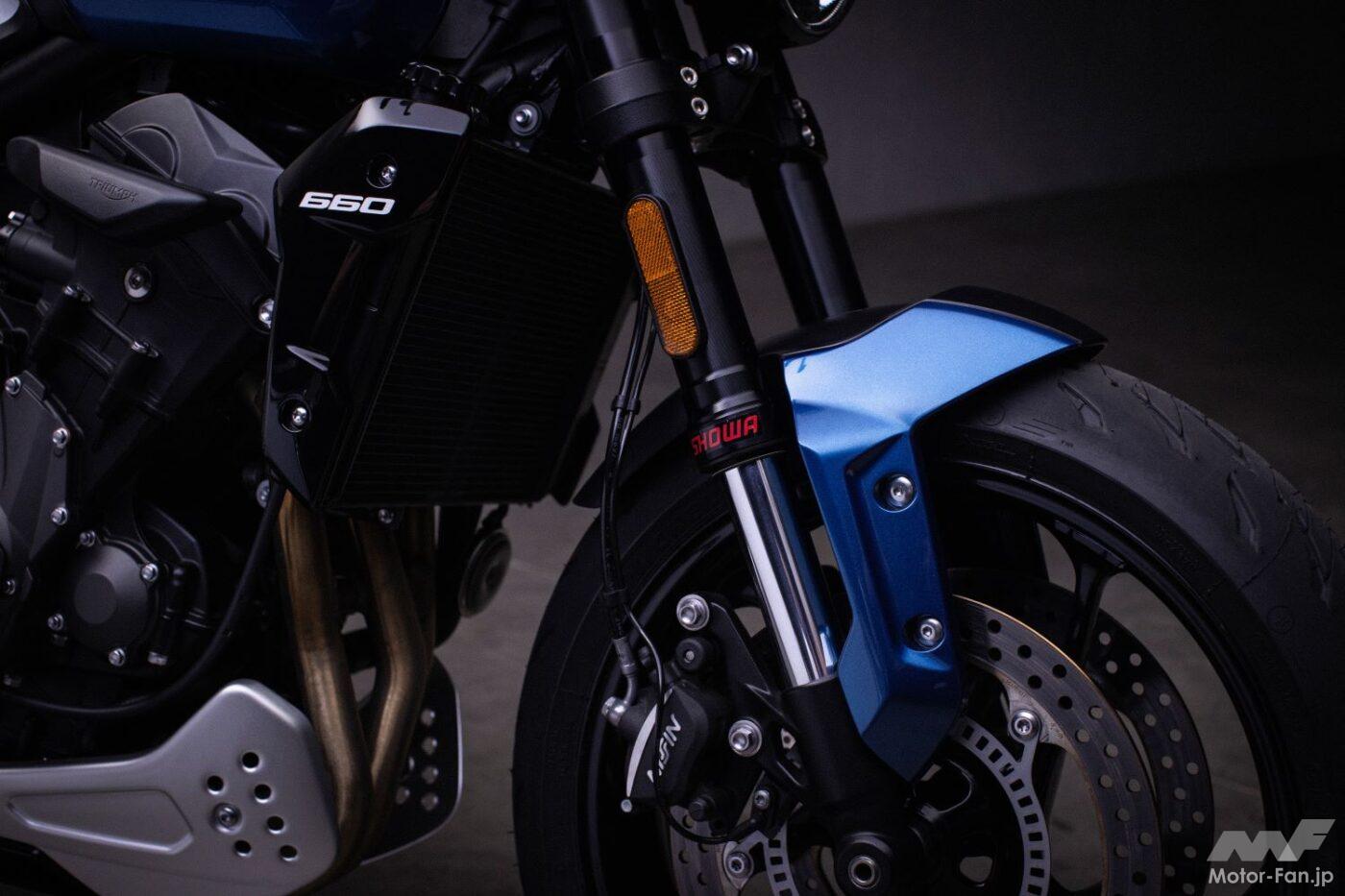 新型Trident 660はハイスペックなSHOWA製の SFF-BP“ビッグ ピストン” 41mm倒立フォークにアップグレードされ、さらに優れた快適性とコントロール性を実現する。また、同じくSHOWA製のプリロード調整可能なRSU、ツイン310mmディスクを備えた強力なNissinブレーキ、そしてグリップ力に定評のあるミシュランRoad 5タイヤが奢られている。
