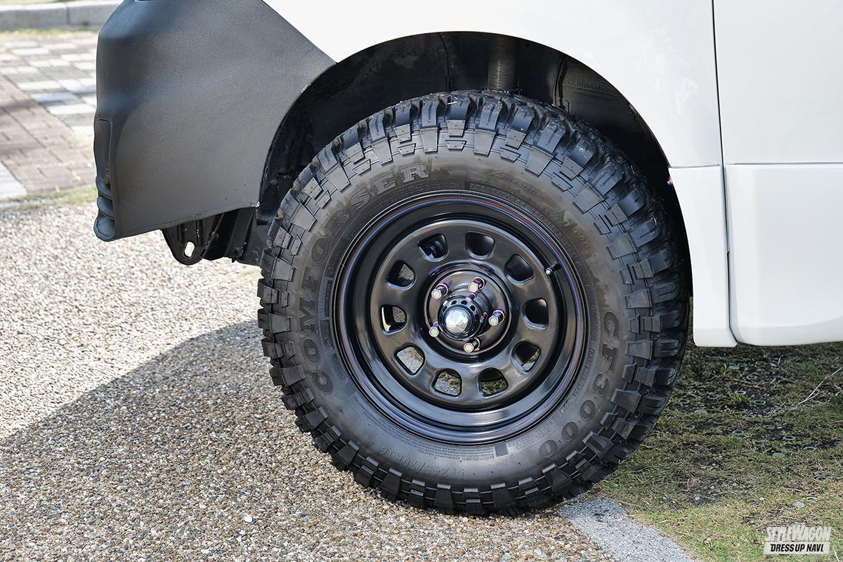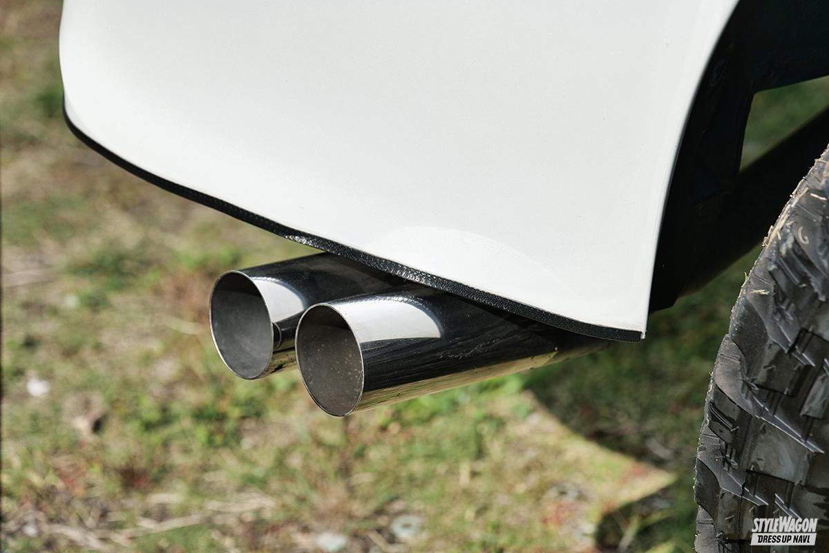 WHEEL●デイトナ/エクスプローラー純正(16×7.0+F20 R12) TIRE●コンフォーサー(245/70) EXTERIOR●F=自作加工、R=バンパーカット、テールレンズ=塗装、ヘッドライト、バグガード、自作ヒッチステップ、ルーフキャリア=イノー TUNING●足まわり=F RSR車高調ブラケット加工/R 40エスティマ純正+テイン製ブラケット加工、ワンオフマフラー 他