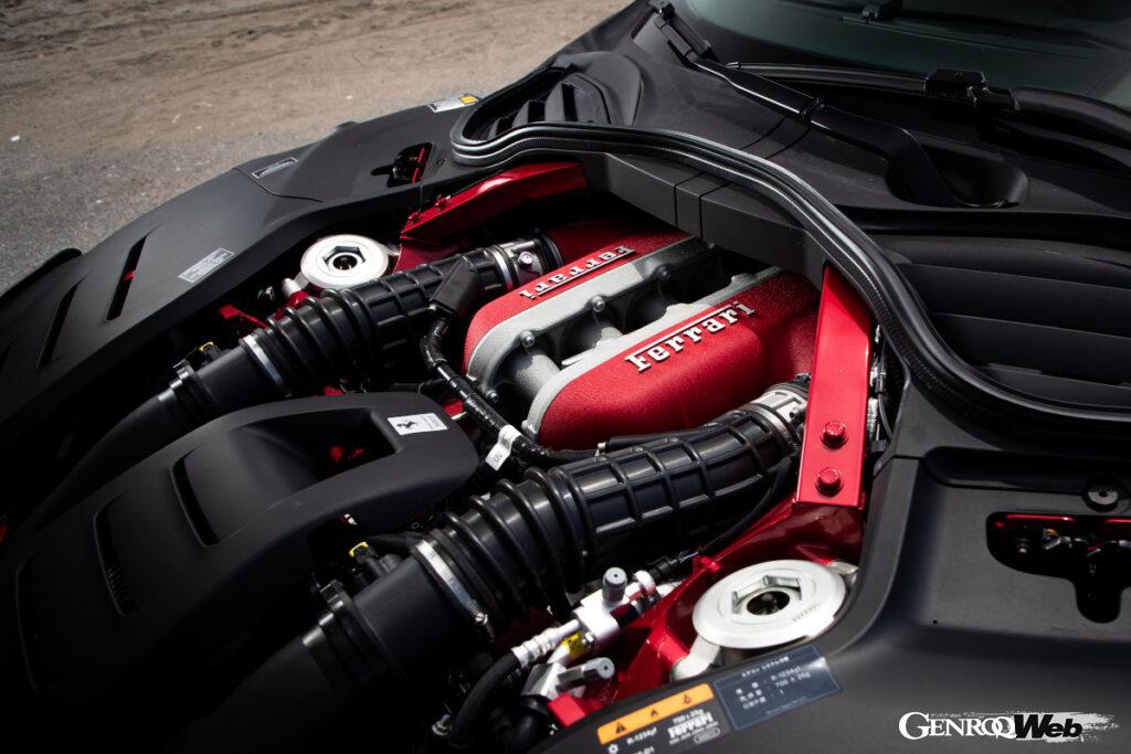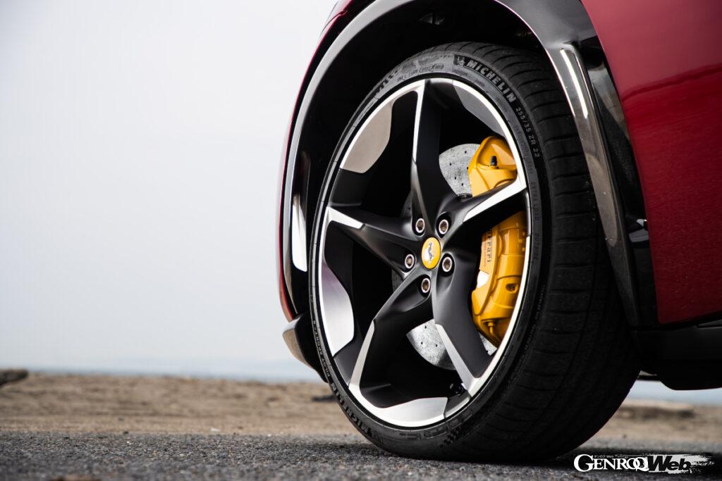 搭載されるのはF140IA型6.5リッターV型12気筒自然吸気エンジンで、「エンツォ」に端を発する伝統のフラッグシップパワーユニットである。そのV12にトランスアクスル方式の8速DCTを組み合わせ、駆動方式は4シーターモデル「GTC4ルッソ」にも採用されるフロントデフをエンジン前に搭載する4RM-SシステムによるAWDだ。逆アリゲーター式ボンネットを開けて、エンジンの位置を見たらきっと驚くだろう。エンジンの前端にフロントアクスルが位置しているのだ。その甲斐あって重量配分は49対51を実現している。
