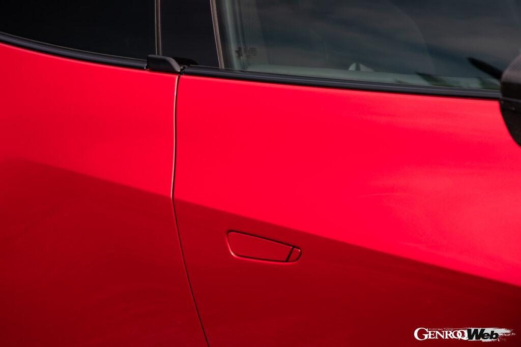 プロサングエはフェラーリ初の4ドア、4シーターモデルである。車名はイタリア語で「サラブレッド」を意味する。はたして鮮やかなロッソ・ポルトフィーノの実車を見た第一印象は意外と小さいと感じた。最近のこの手のクルマの巨大化もあるが、長いボンネット、横から見て傾斜したフロントウインドウ、短いキャビン、絞り込んだサイドが実際よりもボディを薄く小さく見せている。さらにリヤテールランプはSF90に雰囲気が似ており、夜の高速道路で抜かれたらSF90だからしょうがないと錯覚するかもしれない。