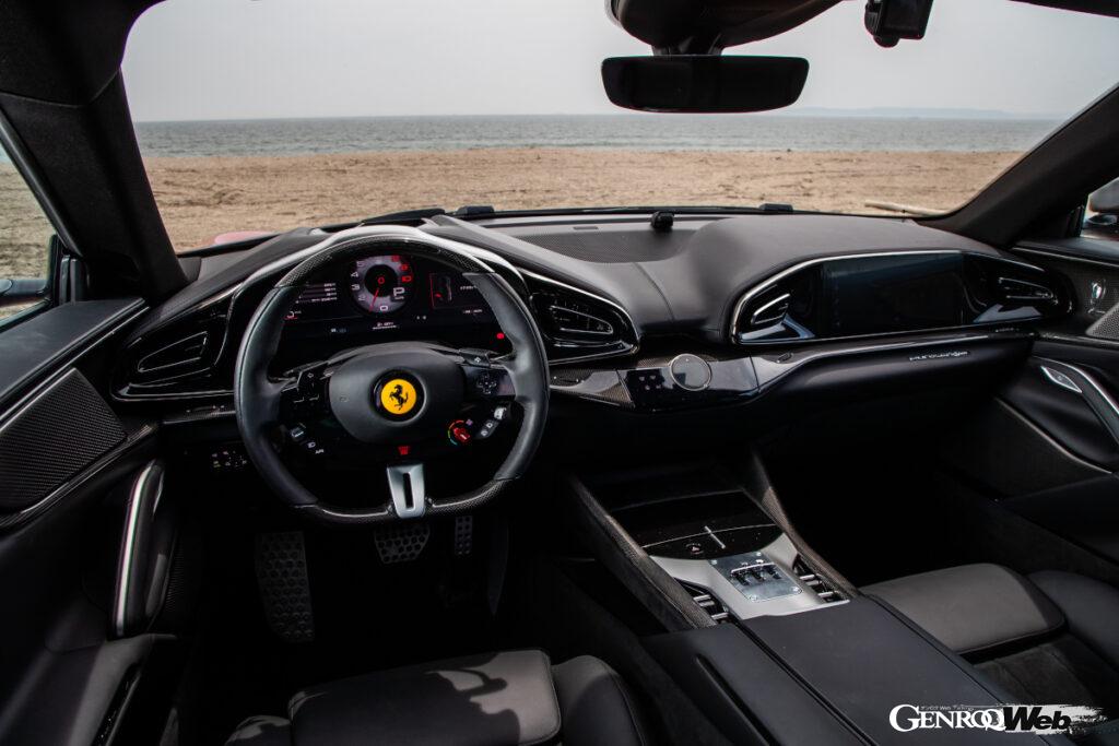 今回は渋滞の首都高を経て、アクアラインを渡って千葉に行って帰るルートで、0-100km/h加速3.3秒、最高速310km/h超を誇るパフォーマンスを体感することはできなかったが、ステアリングを切った感じはやはりフェラーリである。プロサングエはフェラーリらしからぬ全高から、スタイリングばかりが注目を集めているが、低速域でロックトゥロック2回転などは296と同じで、操舵感の解像度も同様に高い。