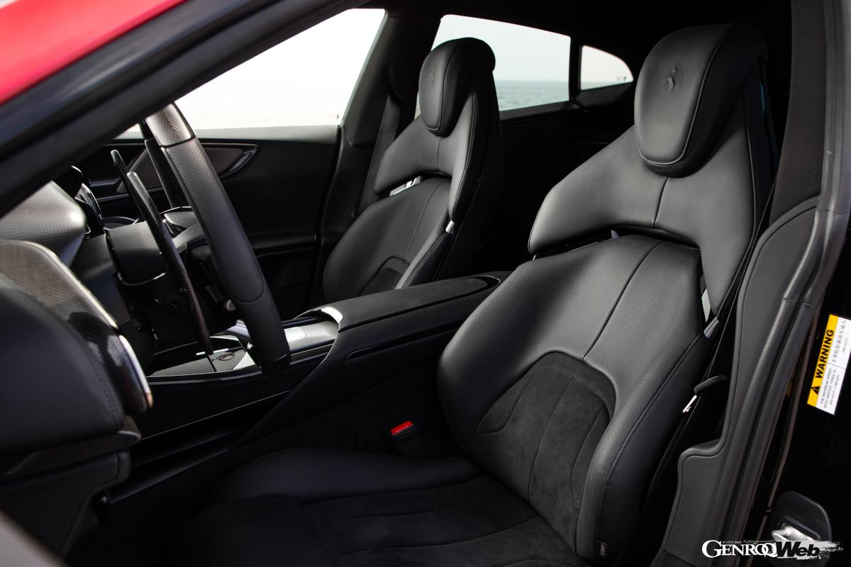 エアコンは中央のセンターコンソールに埋め込まれたダイヤル内の画面をスライドして操作する。もはや猛暑日がスタンダードになった日本における炎天下で、走り出してしばらく操作方法がわからずにエアコンが始動できず命の危険を感じた。渋滞のトンネルでは空気を内気循環にしたいが、これもわかりにくく手間取った。マッサージ機能(オプション)も試乗序盤に発見したかった。色々初見殺しと感じる部分は多かったが、それだけ新しいフェラーリだという裏返しだ。むしろ一つひとつ謎が解けていくのが楽しくなった。もちろん最大の違いはパワーウインドウのスイッチが4つあること。これはフェラーリにとって新鮮だ。