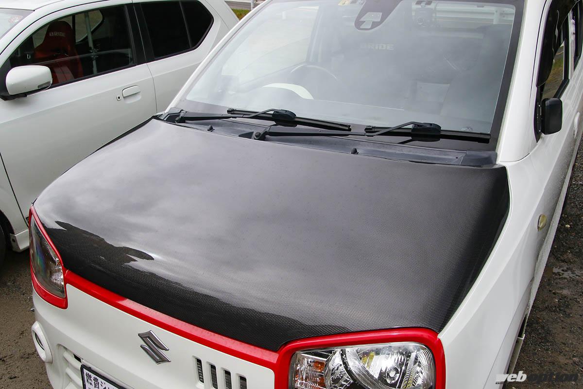 「36アルトは元々車重が軽いんですが、他グレードのパーツを組み合わせることによってさらなる軽量化が可能なんです。そして社外のドライカーボンパーツなども取り入れて、このアルトは600kgジャストまで車重を抑えています」。