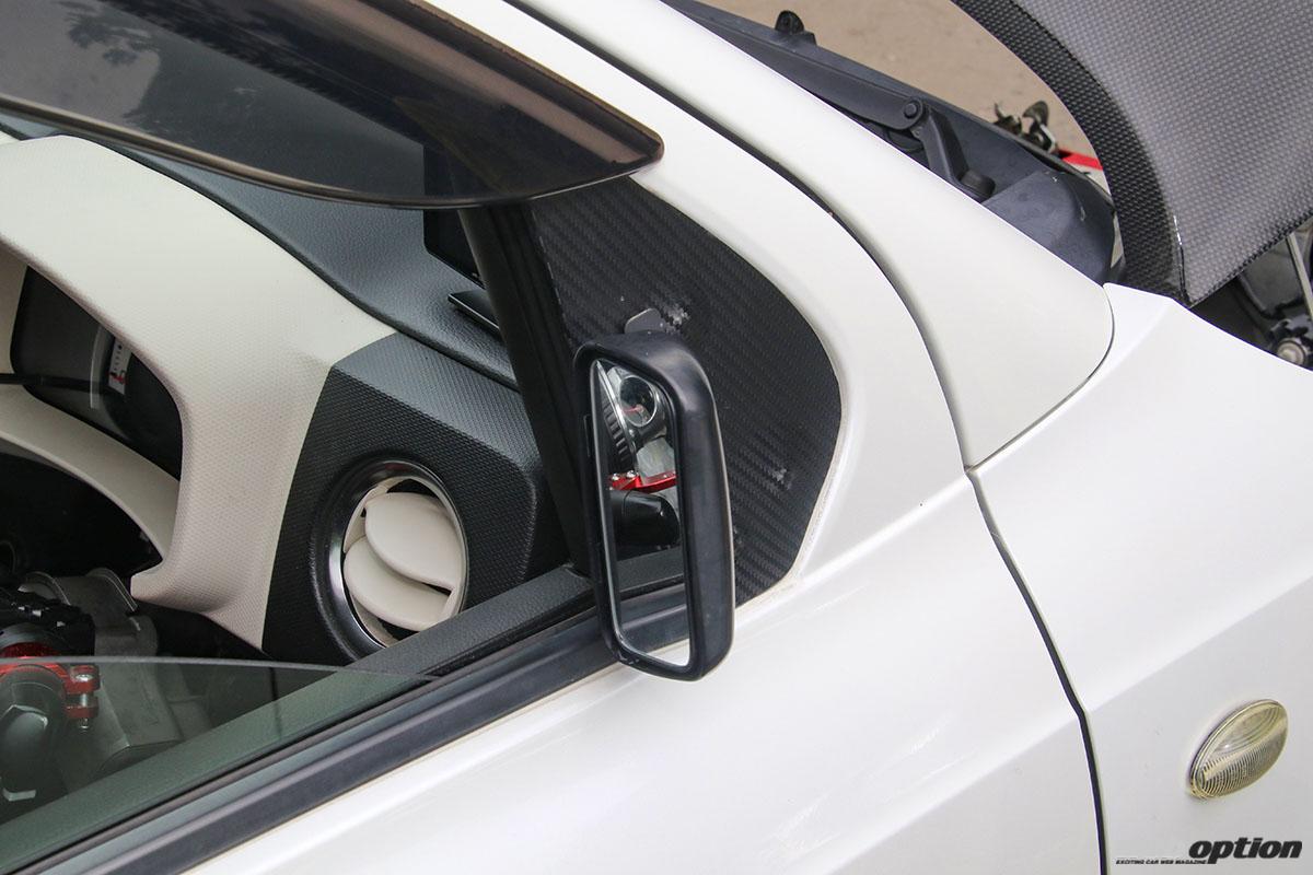 車重だけでなく、走行中の空気抵抗も燃費の悪化を招く原因となる。そのため、リヤバンパーはハーフカットしてパラシュート効果を抑制したり、突起となるドアミラーはコンパクトな自作エアロミラー(保安基準適合)に変更するなど、DIYでエアロチューニングを実施した。