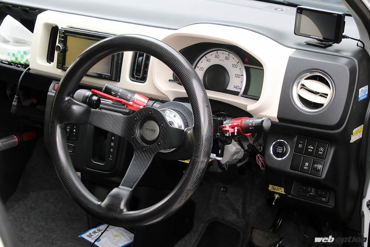 「36アルトは元々車重が軽いんですが、他グレードのパーツを組み合わせることによってさらなる軽量化が可能なんです。そして社外のドライカーボンパーツなども取り入れて、このアルトは600kgジャストまで車重を抑えています」。