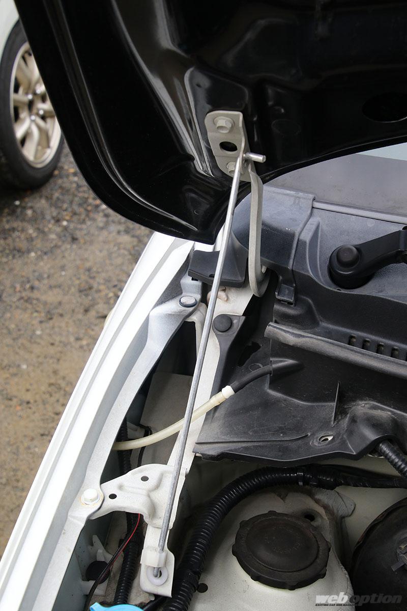 ボンネットロッドはアルミでワンオフ、さらに各部のボルトやナットは樹脂やチタンに変更することで、グラム単位の軽量化を積み重ねている。