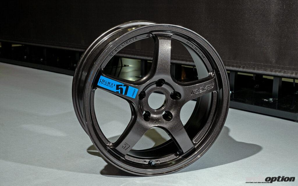 57CRスペックDからローレット加工を省いた廉価モデルの「57スペックM」にも7.0J×17サイズが追加ラインナップ。スマートな5スポークと光沢感のあるスーパーダークガンメタのコンビネーションは美しいの一言。ハードなスポーツ走行を想定していないカスタム仕様ならば、こちらを選択するというのもアリだろう。