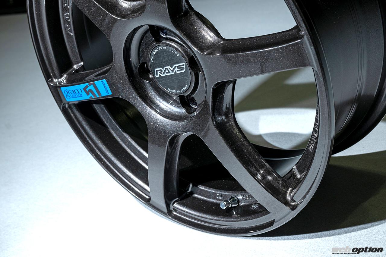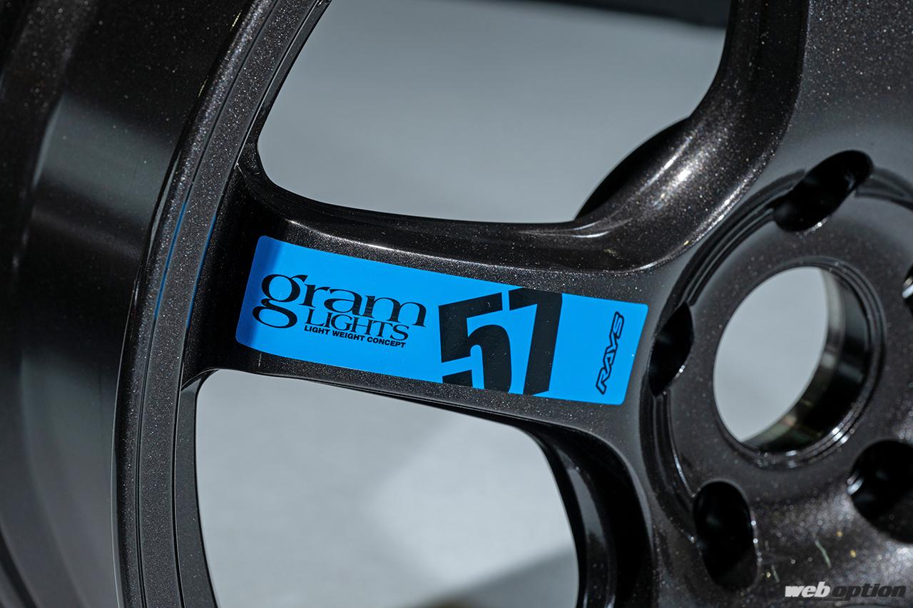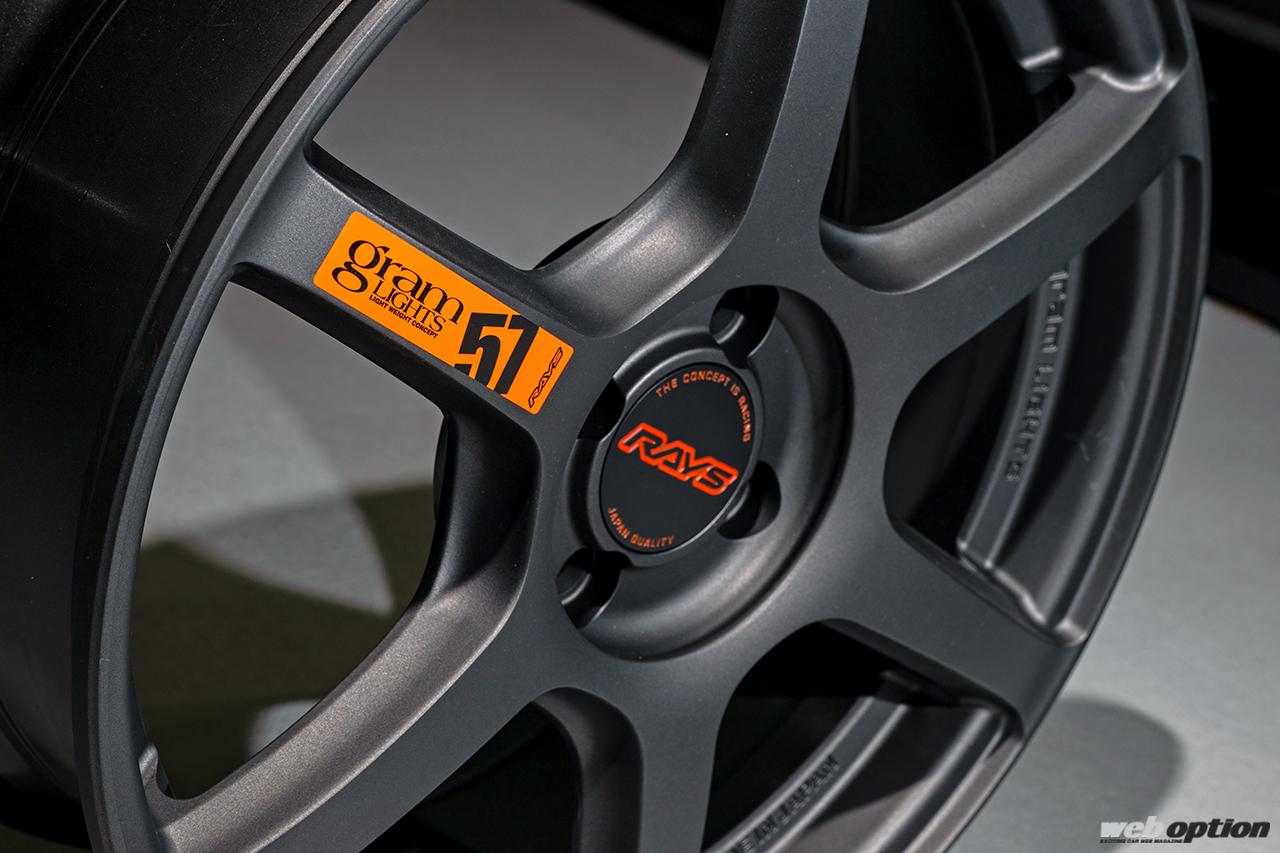 57CRスペックDからローレット加工を省いた廉価モデルの「57スペックM」にも7.0J×17サイズが追加ラインナップ。スマートな5スポークと光沢感のあるスーパーダークガンメタのコンビネーションは美しいの一言。ハードなスポーツ走行を想定していないカスタム仕様ならば、こちらを選択するというのもアリだろう。