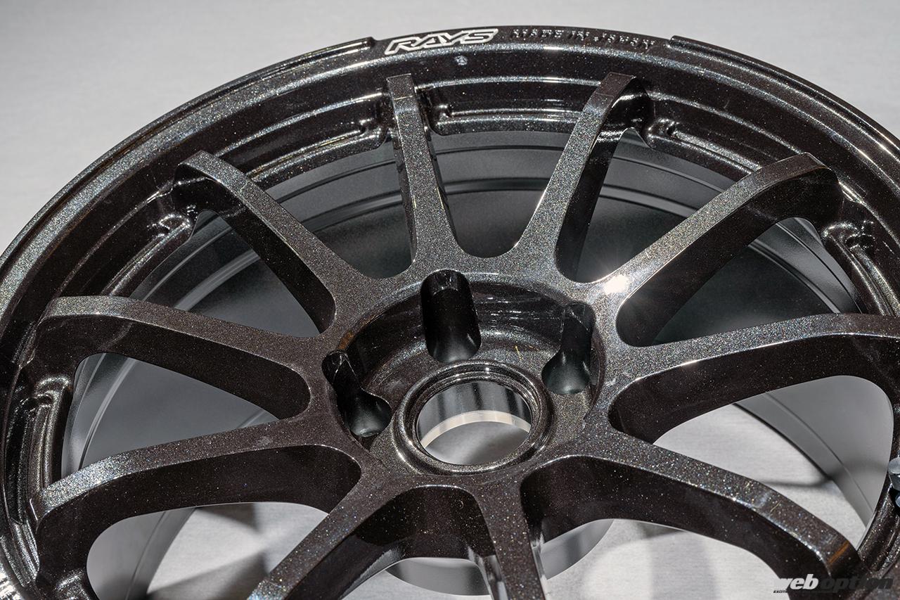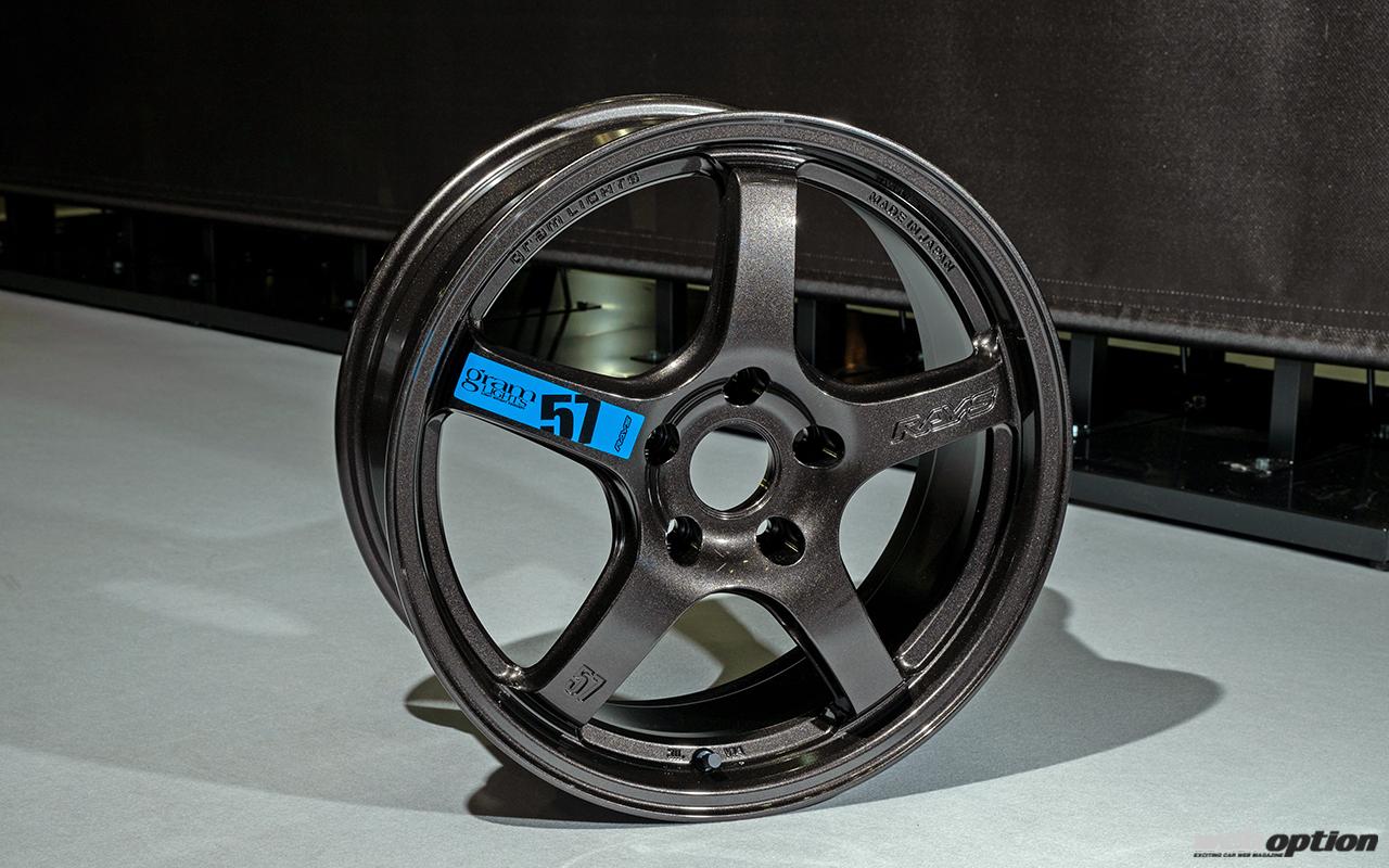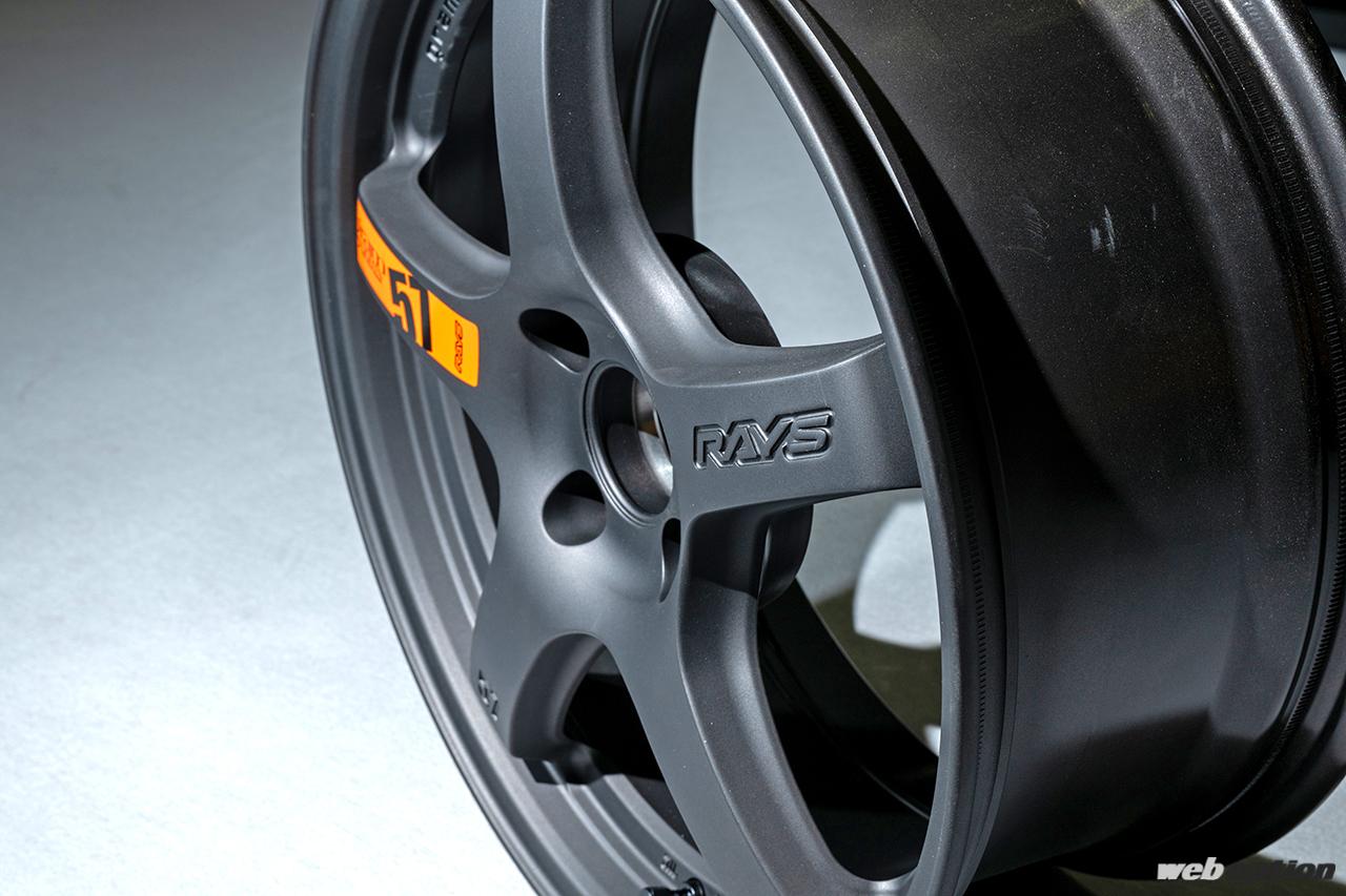 57CRスペックDからローレット加工を省いた廉価モデルの「57スペックM」にも7.0J×17サイズが追加ラインナップ。スマートな5スポークと光沢感のあるスーパーダークガンメタのコンビネーションは美しいの一言。ハードなスポーツ走行を想定していないカスタム仕様ならば、こちらを選択するというのもアリだろう。
