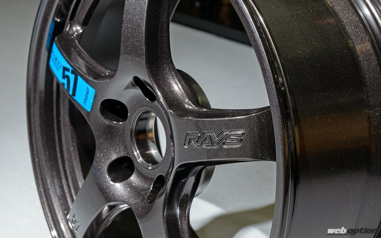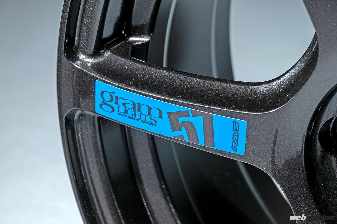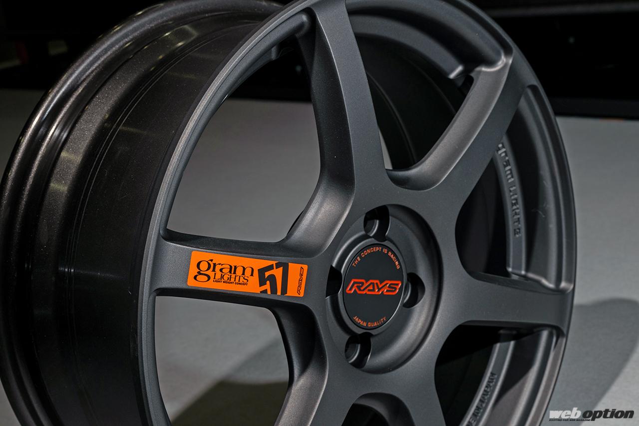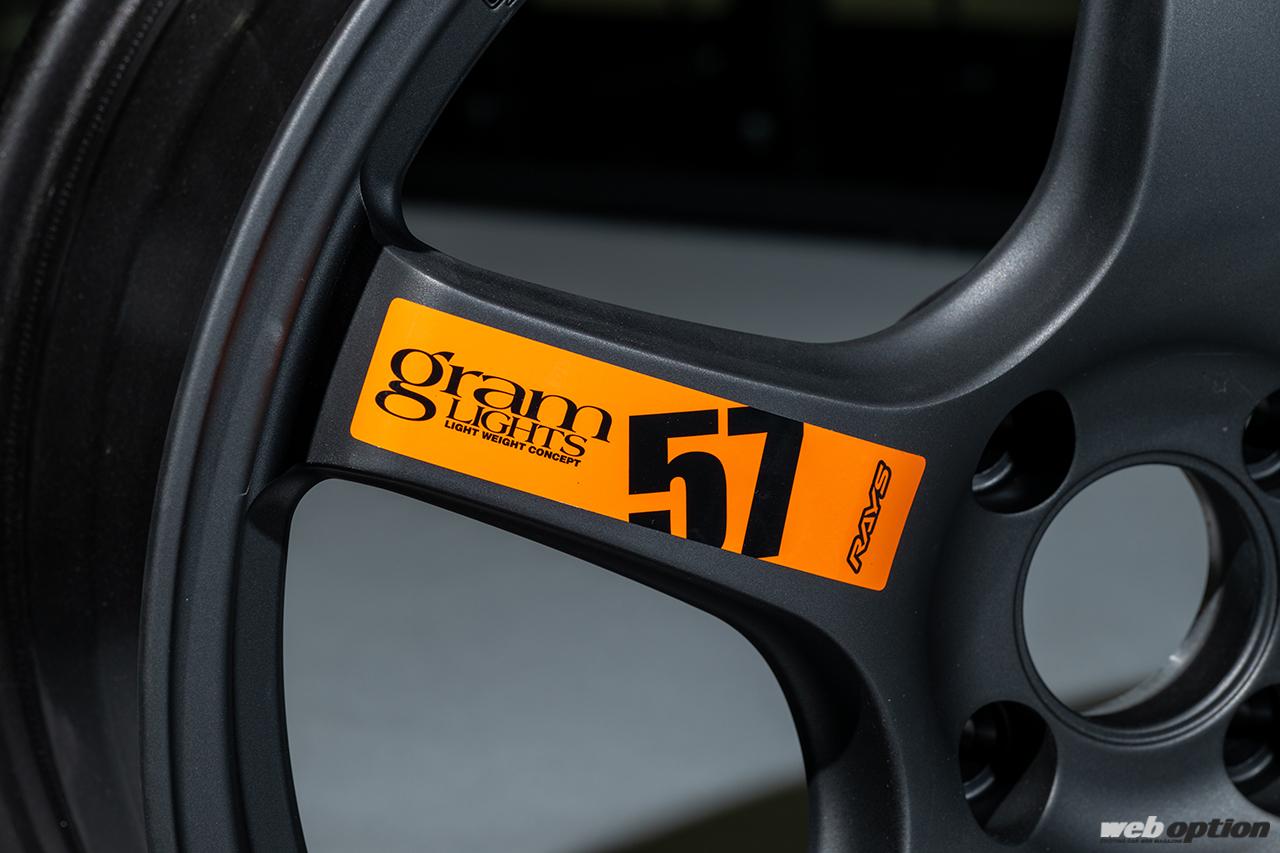 レイズ伝統のN系デザイン(マルチスポーク形状)を採用した完全新作の「57NR」は、車種を選ばない高いデザイン性が魅力のモデル。もちろん、競技ドリフト対応ホイールとしての性能は折り紙付きで、スポーク間には剛性を高める新意匠の「C-FORM」を設けつつ、大きなトラクションが掛かった際に起こりやすいホイールとタイヤの“ズレ”を抑える「ローレット加工」を全サイズで実施。さらに、他の57シリーズよりも重量を増やし、慣性の法則を利用して非力な車両でもドリフトの飛距離が伸びるように設計するなど、随所にグラムライツならではのアイディアが閉じ込められている。