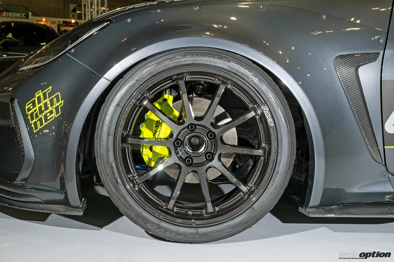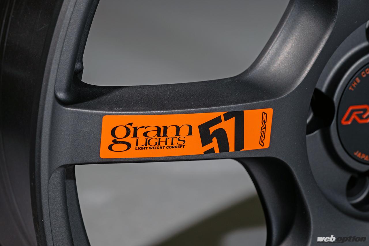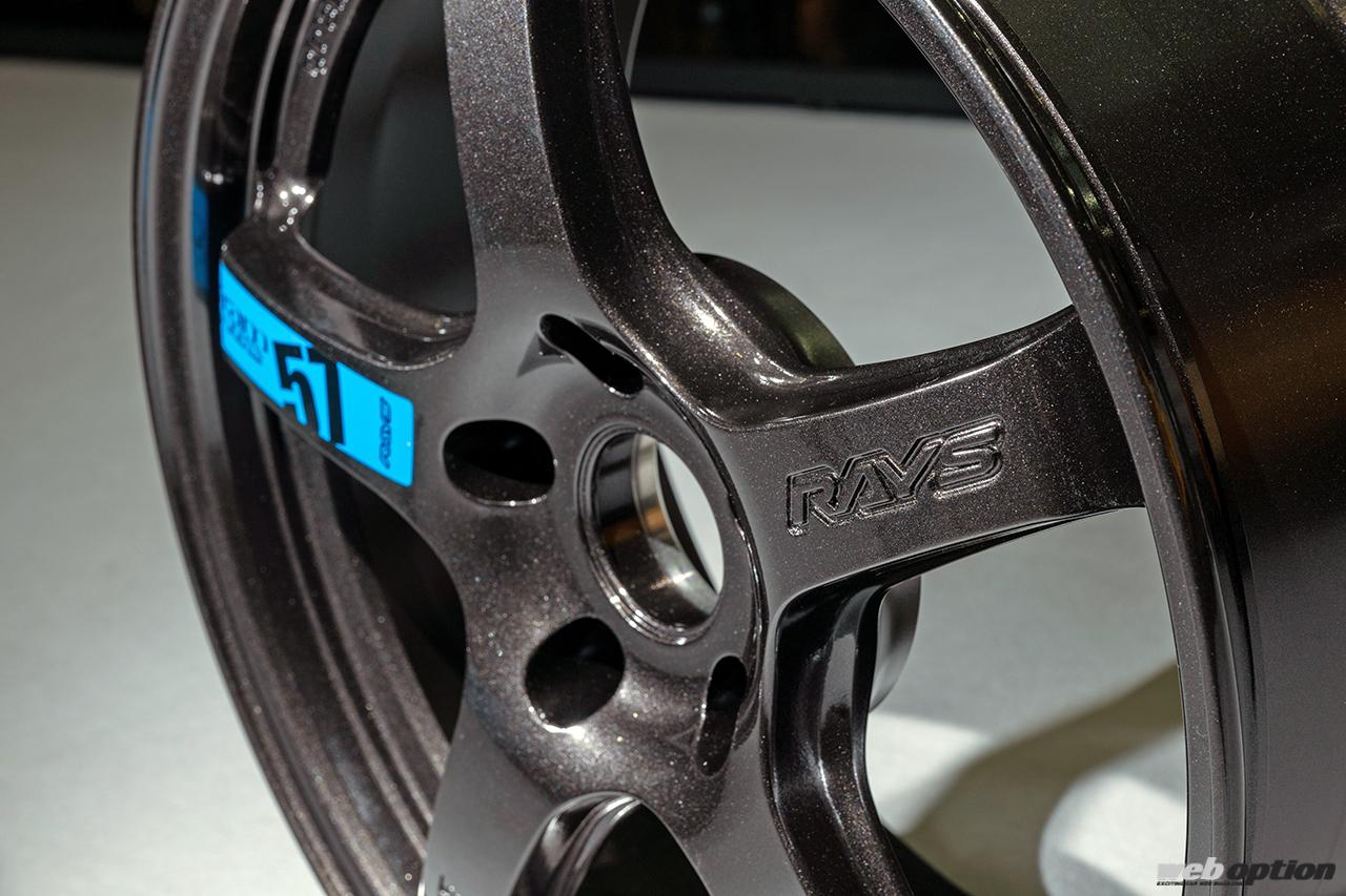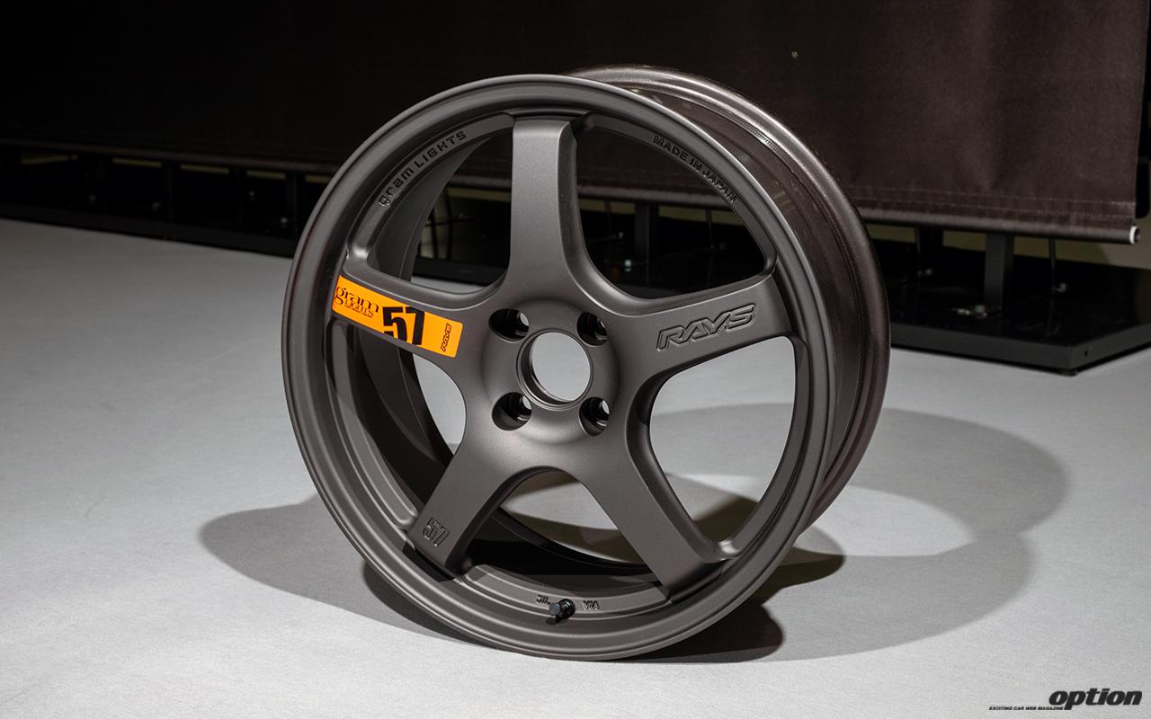 レイズ伝統のN系デザイン(マルチスポーク形状)を採用した完全新作の「57NR」は、車種を選ばない高いデザイン性が魅力のモデル。もちろん、競技ドリフト対応ホイールとしての性能は折り紙付きで、スポーク間には剛性を高める新意匠の「C-FORM」を設けつつ、大きなトラクションが掛かった際に起こりやすいホイールとタイヤの“ズレ”を抑える「ローレット加工」を全サイズで実施。さらに、他の57シリーズよりも重量を増やし、慣性の法則を利用して非力な車両でもドリフトの飛距離が伸びるように設計するなど、随所にグラムライツならではのアイディアが閉じ込められている。