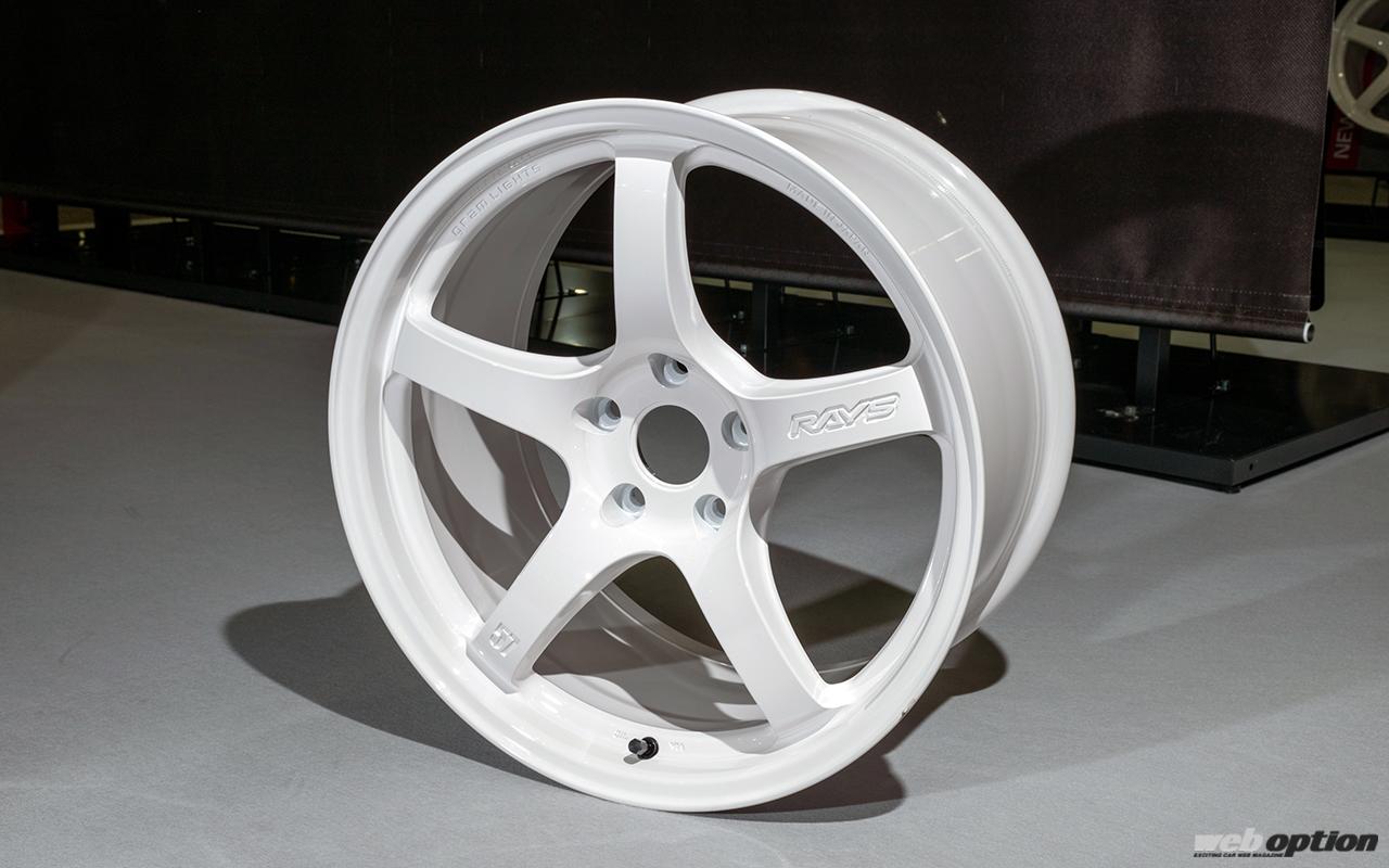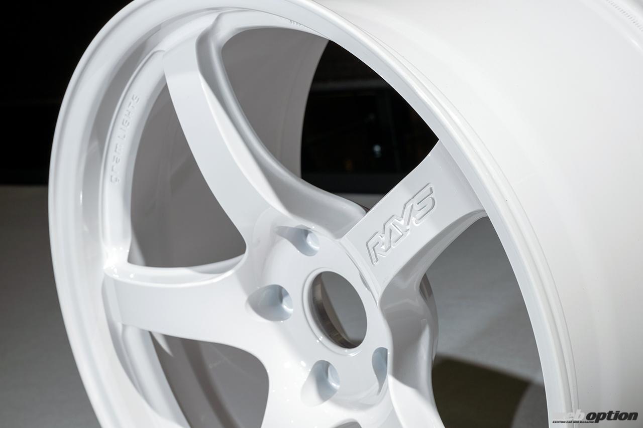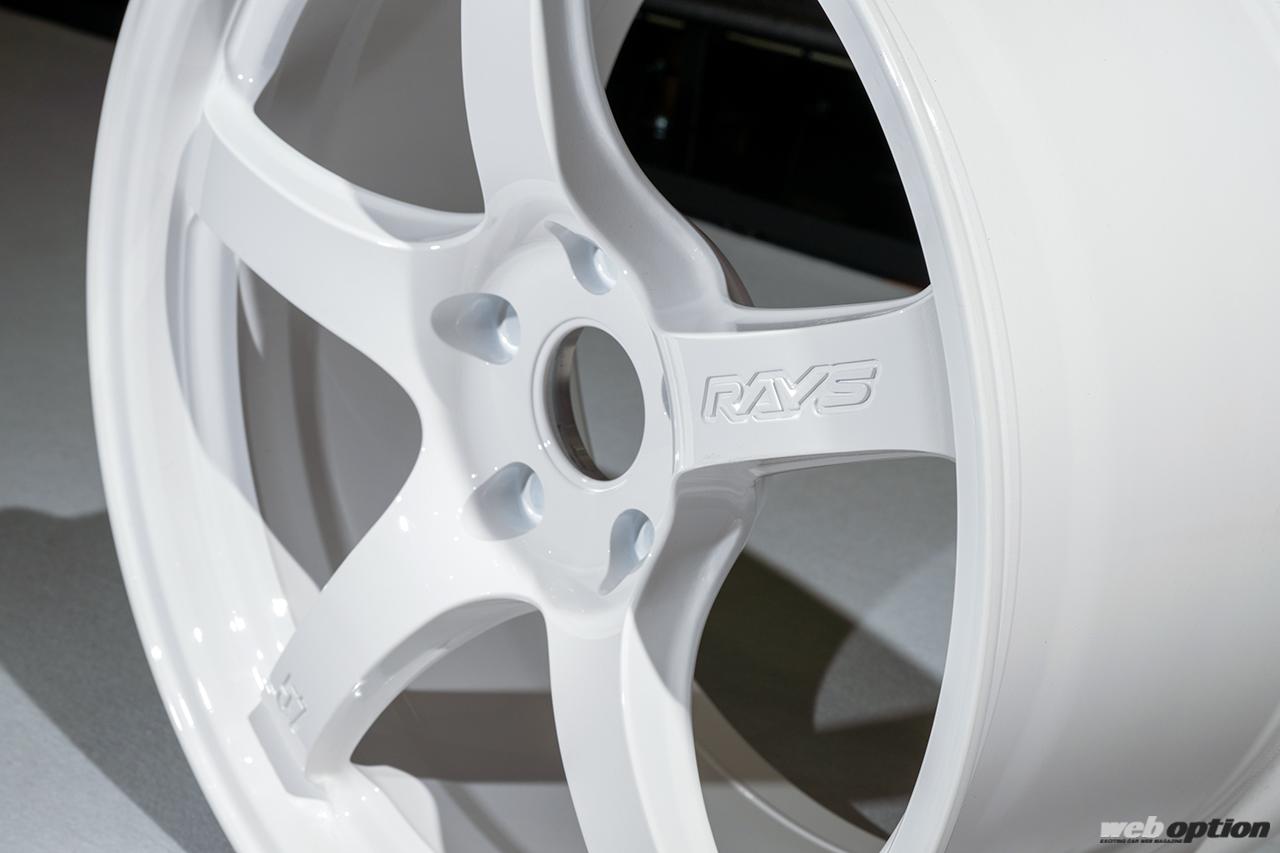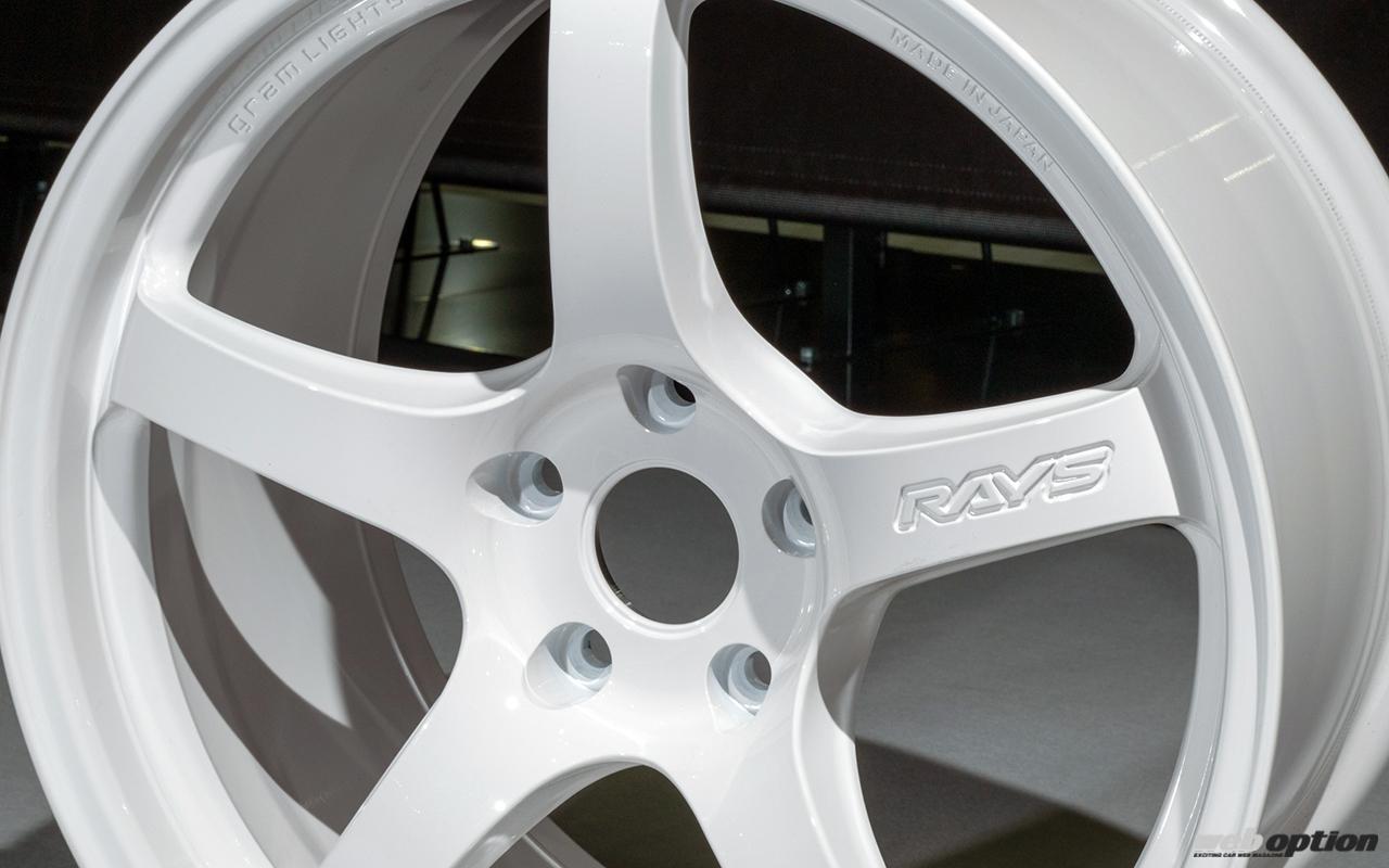 スタンダードな5本スポークデザインで、ドリフトシーンを筆頭に広く愛される「57CR」。海外モデルとして誕生した経緯から、カラーは蛍光イエローや蛍光ピンクなどド派手な設定も多かったが、2024年は一味違う。市場からのラブコールに応える形で“ホワイト”を送り出してきたのだ。なお、スポークにはアイコンナンバー「57」と「RAYS」のロゴが美しく刻まれる他、スペックD同様のローレット加工も施される。