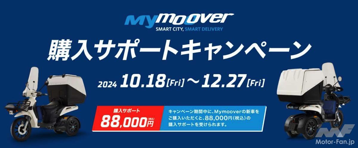 ピアッジオグループジャパンは、「ピアッジオ・マイムーバー」の購入サポートキャンペーンを実施する。車両価格は94万6000円で、購入者に8万8000円をサポートする。全国のピアッジオ・ベスパ正規販売店で利用可能だ。マイムーバーは前一輪・後二輪のトライクとなる。車体前方にはキャリアを備え、リアには261Lの容量を誇る大型のラゲッジボックスを装備する。エンジンは125ccの水冷4ストローク単気筒SOHCで、最大出力8kW(10.7HP)/8750rpm・最大トルク10Nm/5250rpmのスペックとなっている。