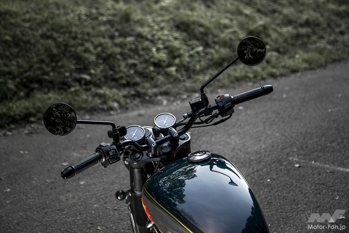 野暮ったい感じになってしまっている要因の一つは塗装だ。旧車だったら金属パーツの多くが磨かれて鈍く光っているのだけれどそれがない。エンジン周辺のパーツはほとんどすべてペイントされているし、ハンドル周りのパーツほとんどがブラック塗装になっている。細かく見ていくと当時をイメージしてデザインされた部品も「惜しい」と思うものが多い。しかし逆を言えばカスタムのしがいがあるということ。塗装を落として磨きあげるだけでもイメージが激変するはずだ。