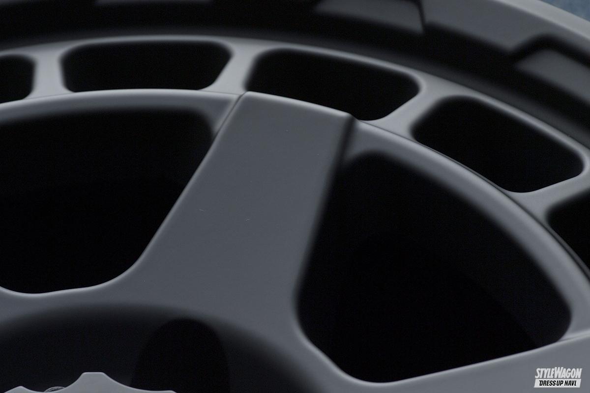 マッドヴァンスⅩの中で最も王道なオフロード系モデルと言えるのが、コンケイブディッシュのタイプF。12本フィンにも12ホールディッシュにも見えるそのセンターパートデザインはワイルドで、マッドヴァンスのロゴがディッシュ面に刻印されているなど、ミリタリー系にもハマりそうなパワー感に満ちているのが特徴だ。外周部がスクエア基調なデザインとなっているため、センター部のスクエアな窓とのシンクロ感もバツグン。アグレッシブさやパワー感をダイレクトに伝えられるデザインに仕上がっている。カラーは王道のフルマットブラックと、ザラついた質感がアウトドアムードを高めるフリントブロンズの2色。オーナメントはヘアライン、マットガンメタを同梱。