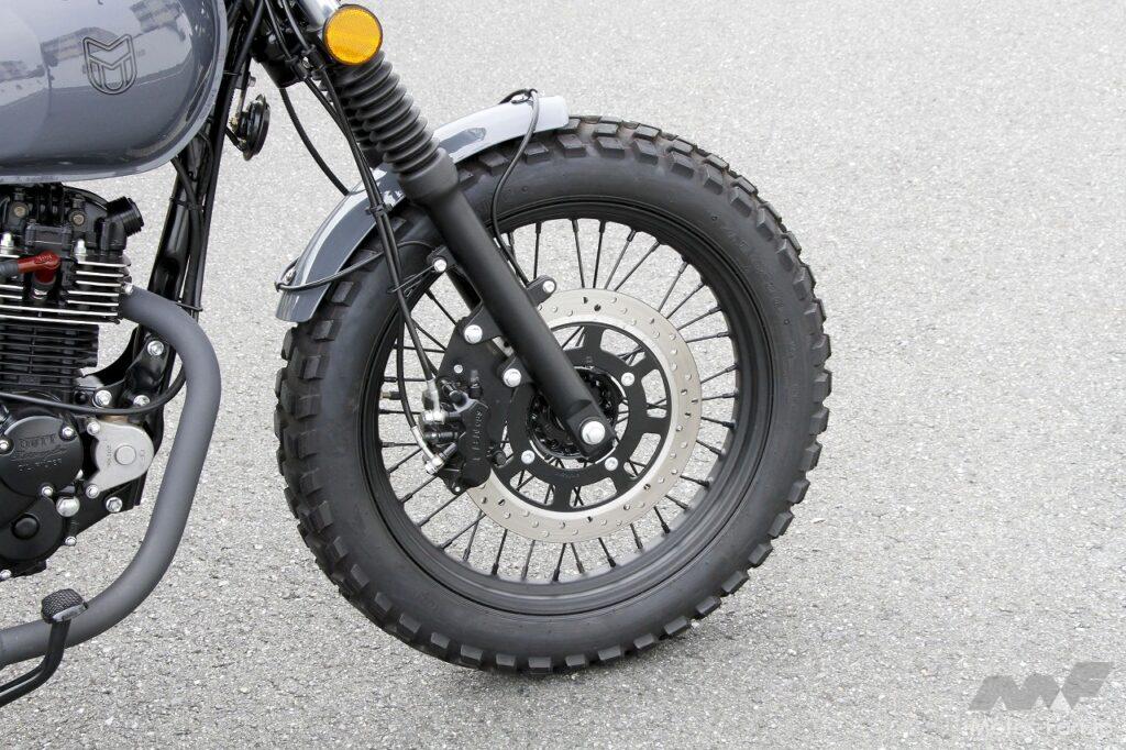 特徴的なところはほかにもあります。HILTS125はスタイリングだけ見ればトラディショナルなロードモデルです。しかし前後18インチのワイヤースポークホイールには極太のブロックタイヤが装着してあり、さらにヘッドライトにはガードまで装着しています。結果、スクランブラー的なバイクに仕上がっているのです。いずれにしても、見飽きることはないデザインなので、長く乗り続けられるモデルになっていると思います。