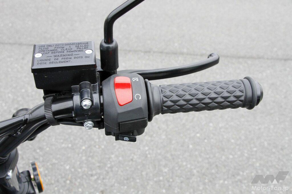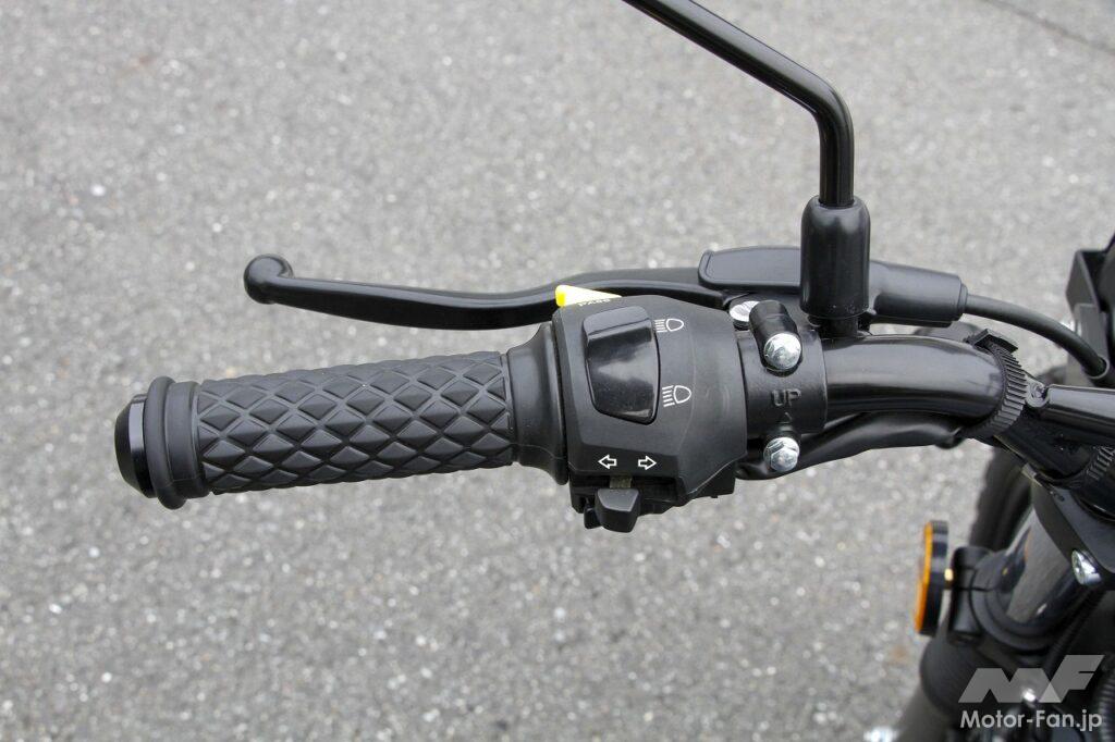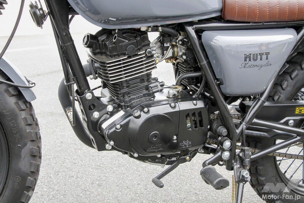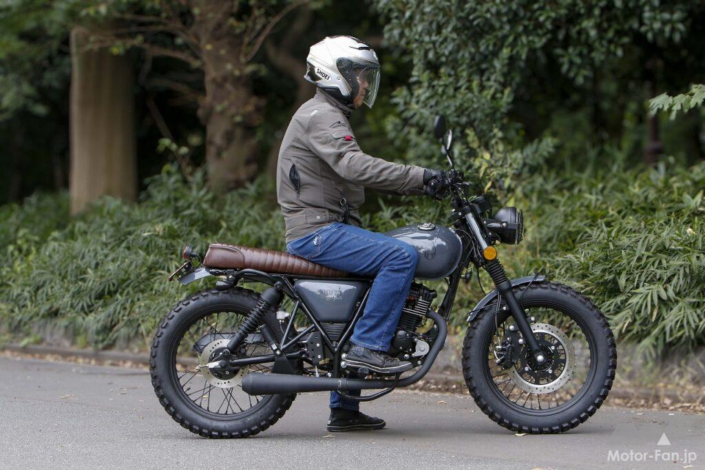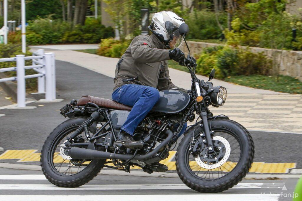 エンジンはシンプルな空冷シングル。スズキGN125をベースにしたもので5速ミッションを採用しています。最高出力は11ps程度なのでパワフルな印象はありません。しかしスムーズにレスポンスする特性でだれにでも扱いやすく、ストリートでの発進加速に不足はありません。パワー、トルクともに適度なものなので、日常的にアクセル全開にできる爽快感が味わえるのがひとつの利点です。市街地走行から郊外のツーリングといった使い方にはちょうどいいと思いました。ただし、上りが続く峠道などでは加速が要求どおりにいかず若干ストレスがたまるかもしれません。まあ125㏄なのでそんなものかと理解して走る必要があります。