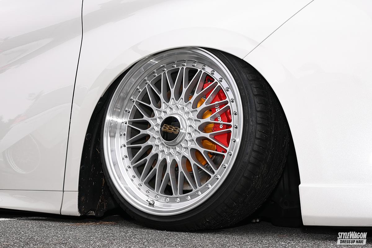 特徴的なエアロを……という方向性ではなく、純正を崩さずにシンプルに、という方向性でカスタマイズ。その象徴は前後のバンパーだ。純正バンパーにシンプルな造形のリップを加工・一体化しているのだ。だから純正らしさはまったく損なっていない。その上でエアサスを用いて激低フォルムに仕上げている。足元も印象的。ホイールはBBS、ブレーキはブレンボと、“憧れのブランド”を積極導入。ここまで完成度が高いと、次何をするのか気になりますね。